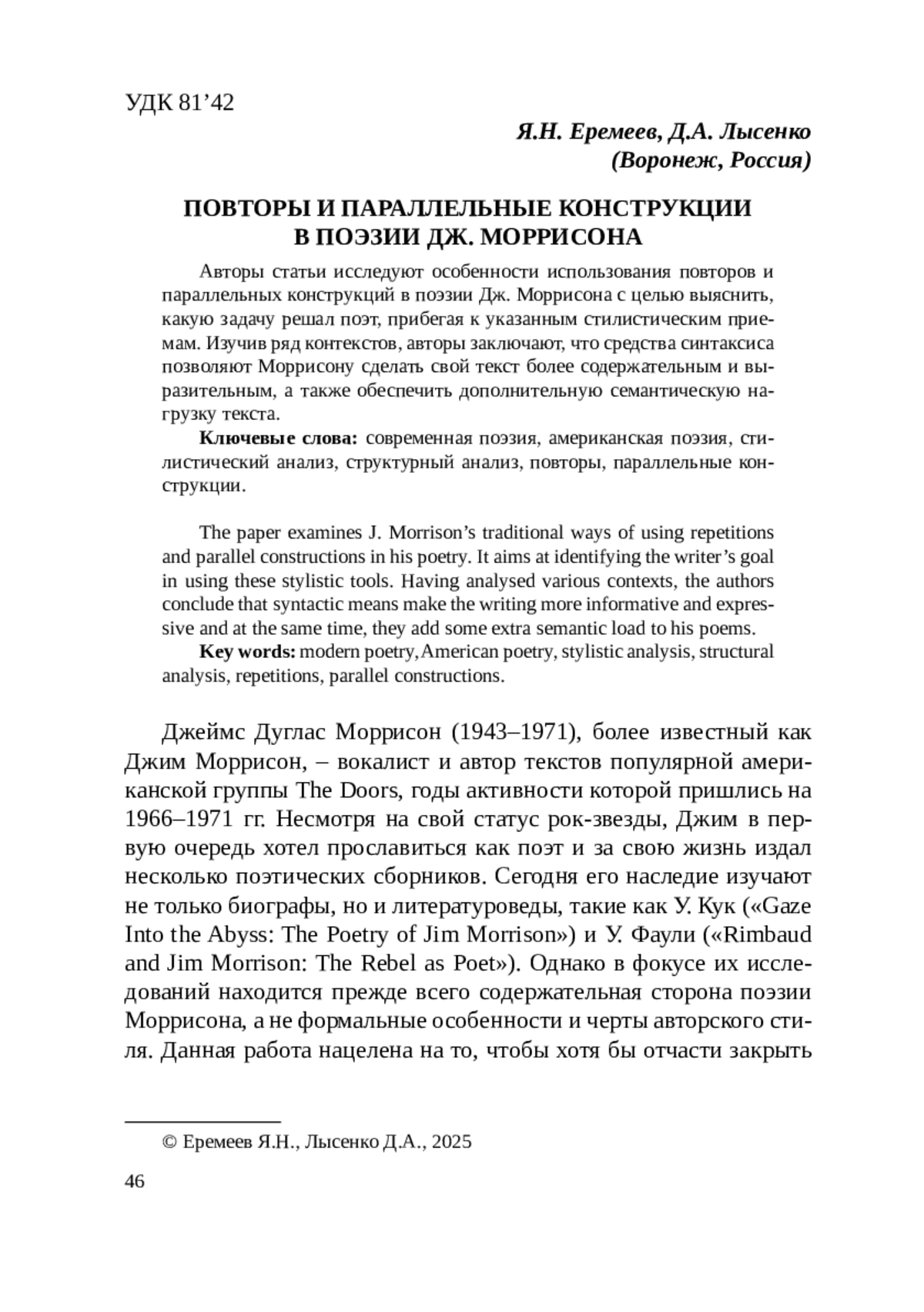 Авторы статьи исследуют особенности использования повторов и параллельных конструкций в поэзии Дж. Моррисона с целью выяснить, какую задачу решал поэт, прибегая к указанным стилистическим приемам. Изучив ряд контекстов, авторы заключают, что средства синтаксиса позволяют Моррисону сделать свой текст более содержательным и выразительным, а также обеспечить дополнительную семантическую нагрузку текста.