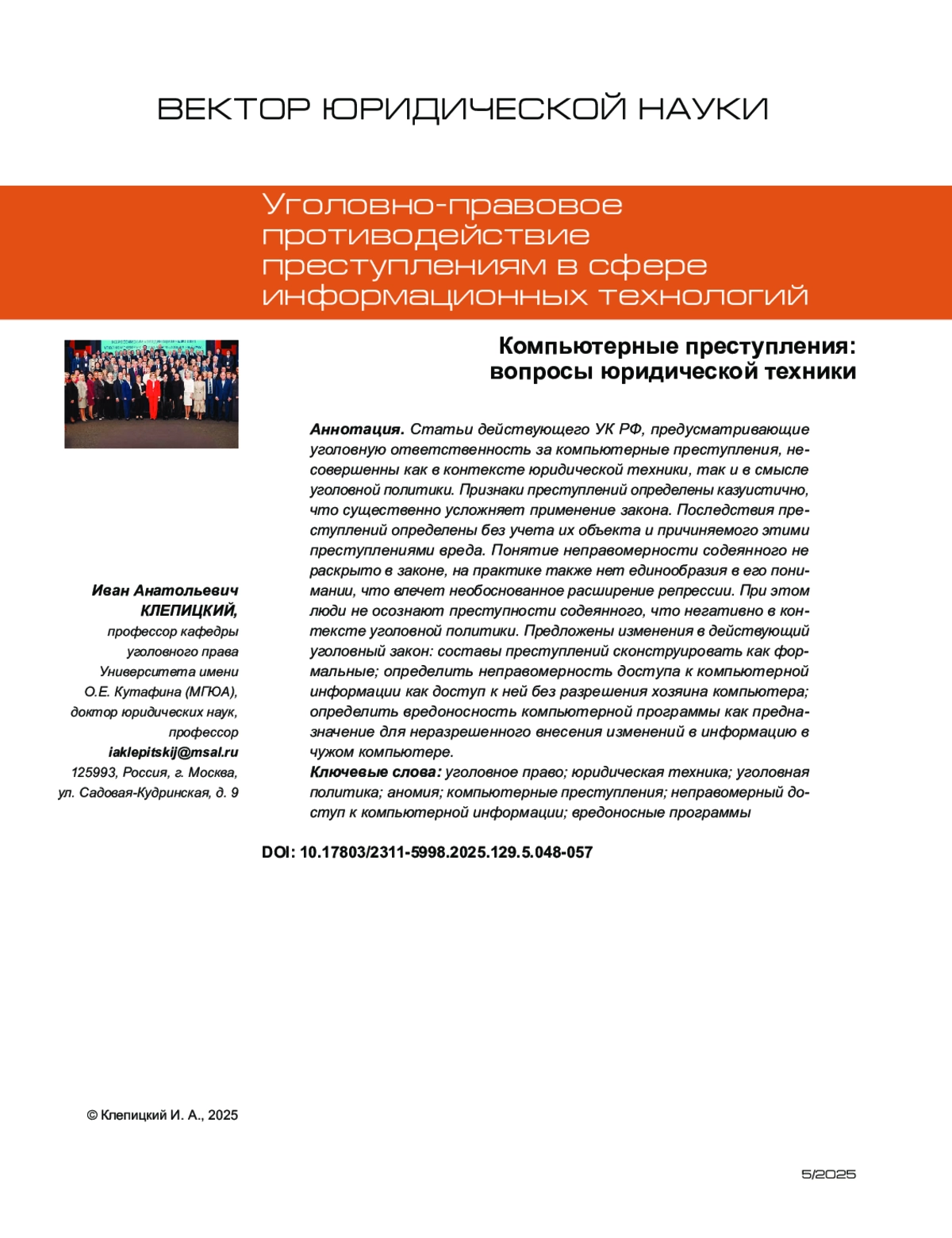 1. Русскевич Е. А. Понятие вредоносной компьютерной программы // Актуальные проблемы российского права. - 2018. - № 11. - С. 207-215.