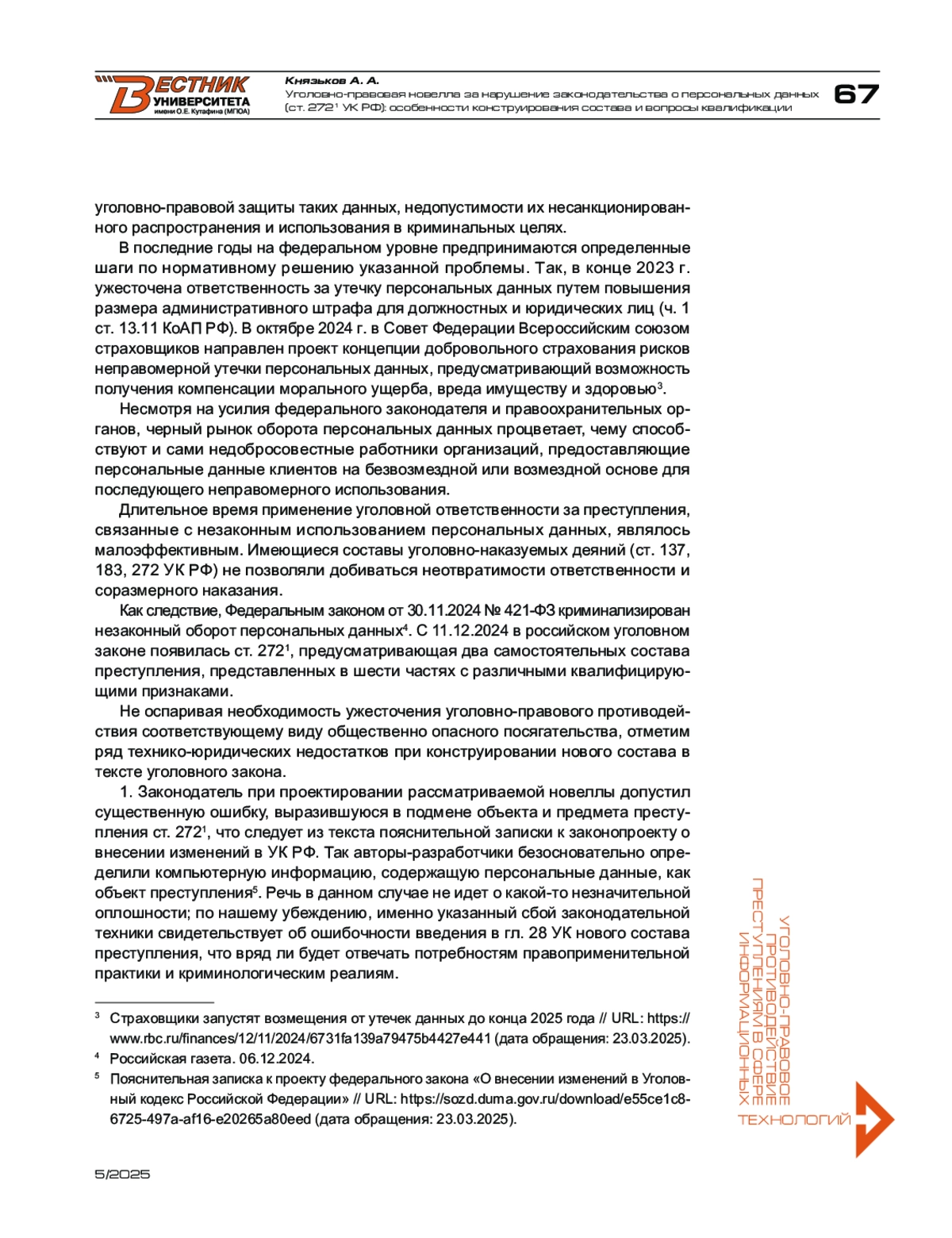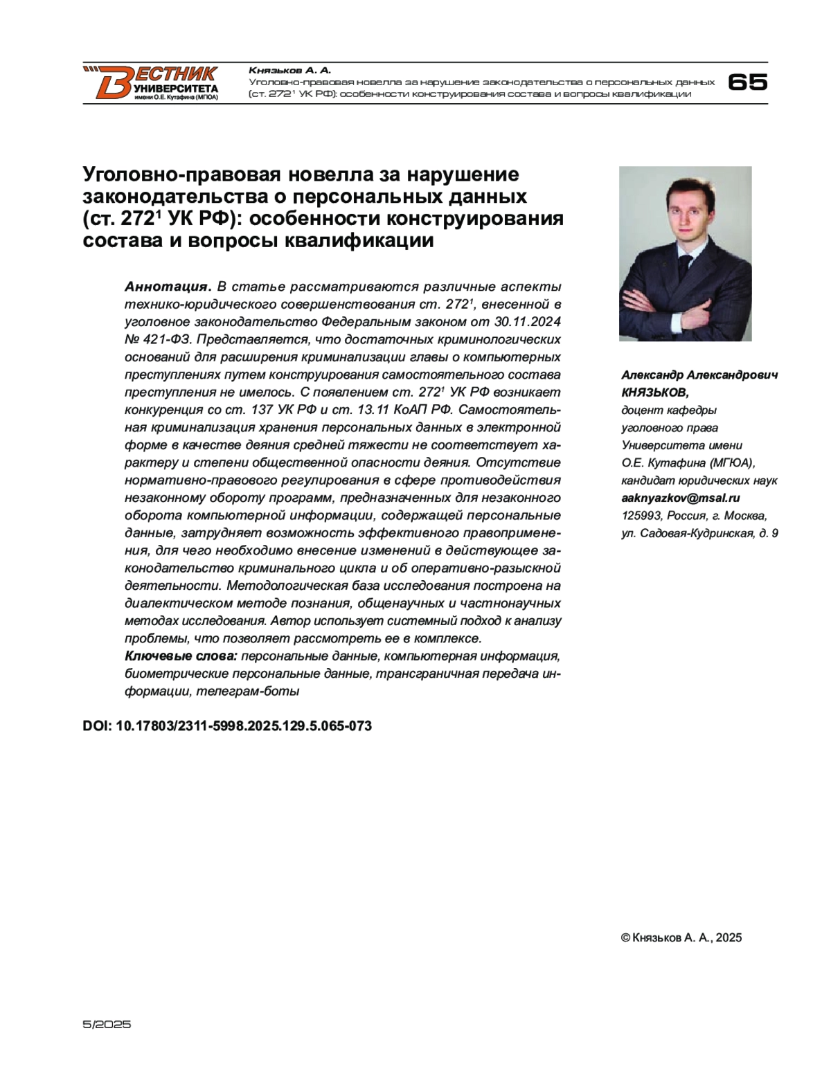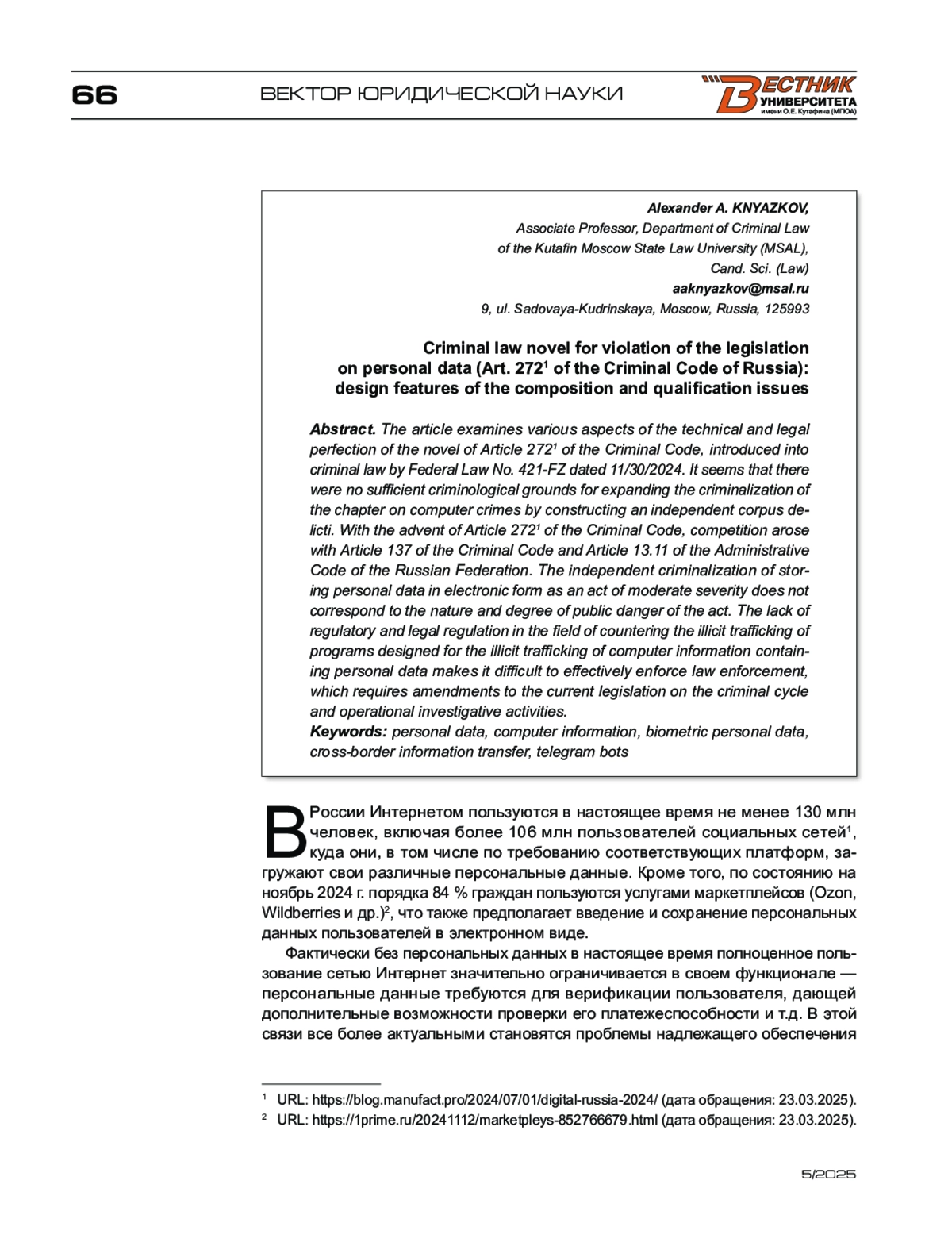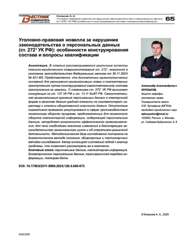 В статье рассматриваются различные аспекты технико-юридического совершенствования ст. 2721, внесенной в уголовное законодательство Федеральным законом от 30.11.2024 № 421-ФЗ. Представляется, что достаточных криминологических оснований для расширения криминализации главы о компьютерных преступлениях путем конструирования самостоятельного состава преступления не имелось. С появлением ст. 2721 УК РФ возникает конкуренция со ст. 137 УК РФ и ст. 13.11 КоАП РФ. Самостоятельная криминализация хранения персональных данных в электронной форме в качестве деяния средней тяжести не соответствует характеру и степени общественной опасности деяния. Отсутствие нормативно-правового регулирования в сфере противодействия незаконному обороту программ, предназначенных для незаконного оборота компьютерной информации, содержащей персональные данные, затрудняет возможность эффективного правоприменения, для чего необходимо внесение изменений в действующее законодательство криминального цикла и об оперативно-розыскной деятельности. Методологическая база исследования построена на диалектическом методе познания, общенаучных и частно-научных методах исследования. Автор использует системный подход к анализу проблемы, что позволяет рассмотреть ее в комплексе.