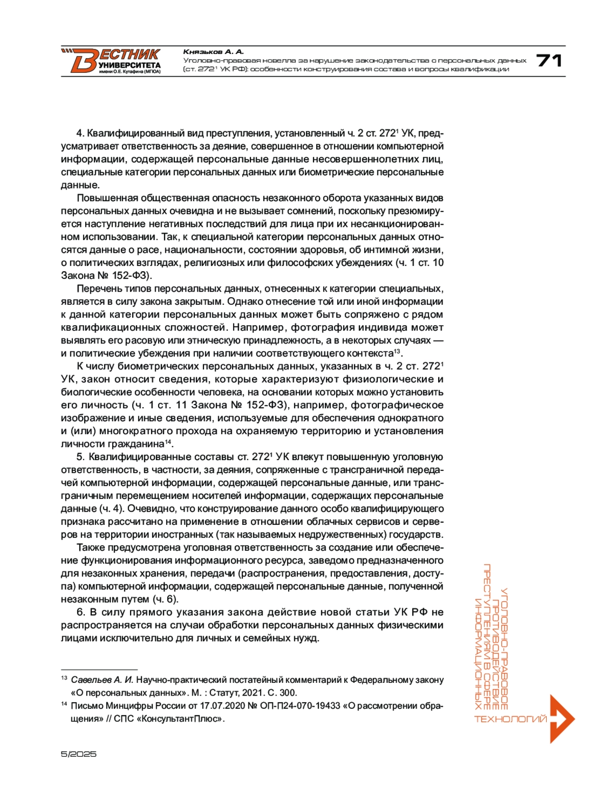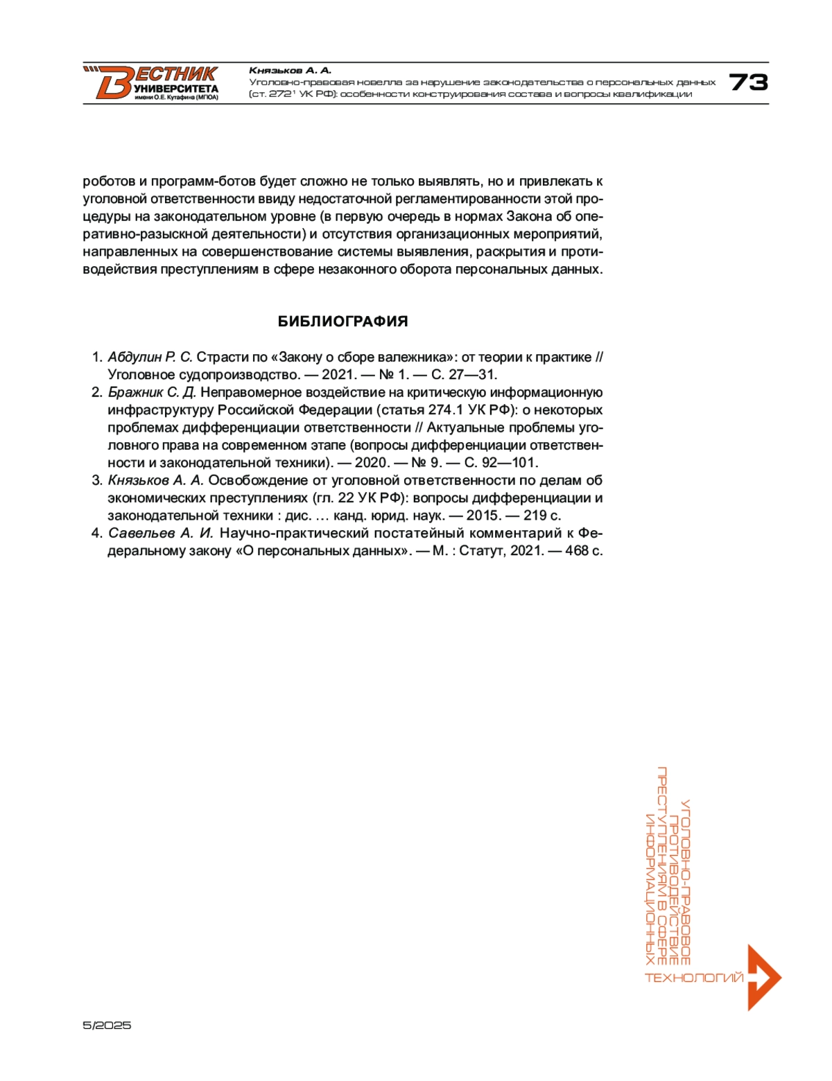 4. Савельев А. И. Научно-практический постатейный комментарий к Федеральному закону «О персональных данных». - М.: Статут, 2021. - 468 с.