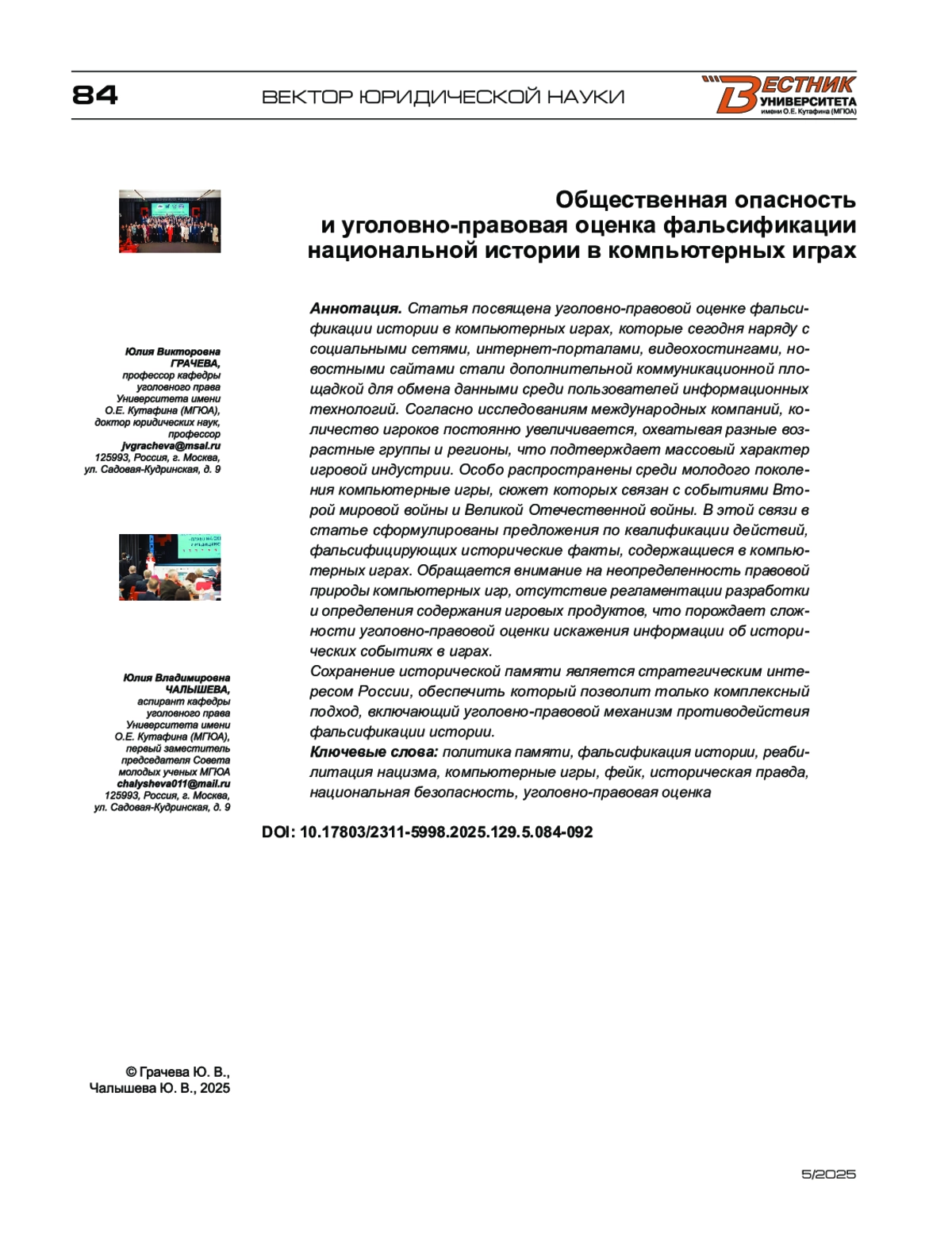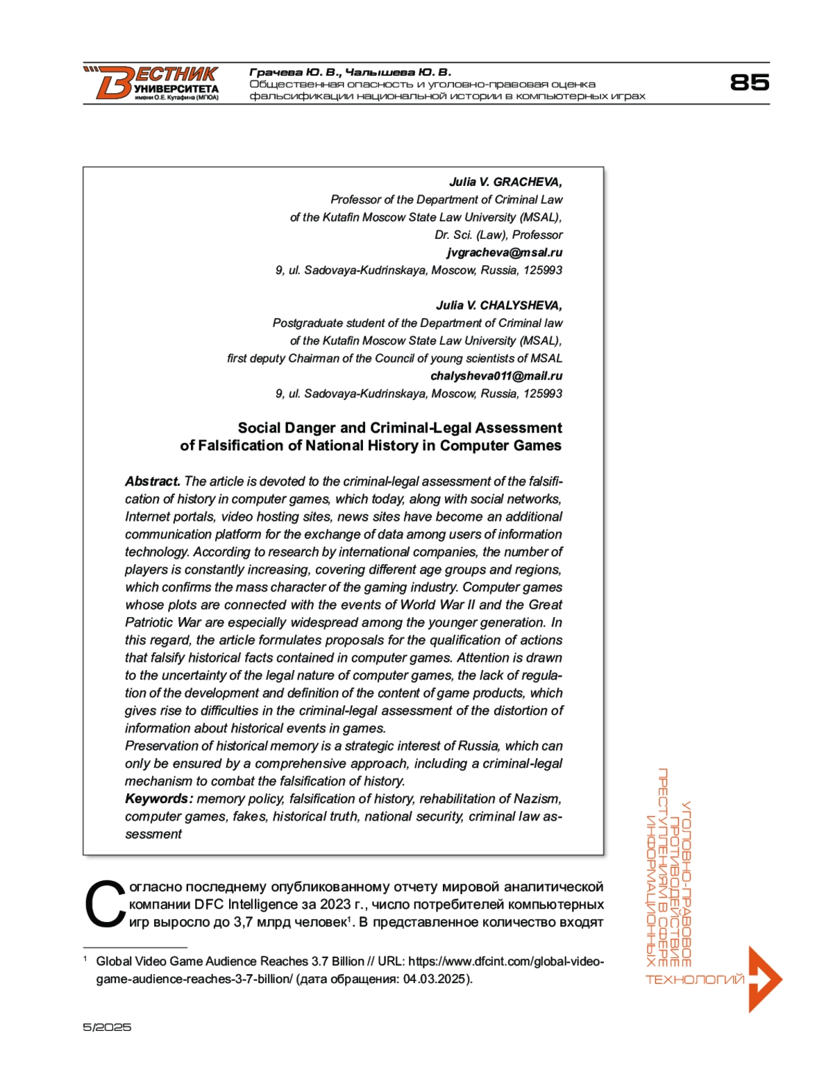 Статья посвящена уголовно-правовой оценке фальсификации истории в компьютерных играх, которые сегодня наряду с социальными сетями, интернет-порталами, видеохостингами, новостными сайтами стали дополнительной коммуникационной площадкой для обмена данными среди пользователей информационных технологий. Согласно исследованиям международных компаний, количество игроков постоянно увеличивается, охватывая разные возрастные группы и регионы, что подтверждает массовый характер игровой индустрии. Особо распространены среди молодого поколения компьютерные игры, сюжет которых связан с событиями Второй мировой войны и Великой Отечественной войны. В этой связи в статье сформулированы предложения по квалификации действий, фальсифицирующих исторические факты, содержащиеся в компьютерных играх. Обращается внимание на неопределенность правовой природы компьютерных игр, отсутствие регламентации разработки и определения содержания игровых продуктов, что порождает сложности уголовно-правовой оценки искажения информации об исторических событиях в играх.