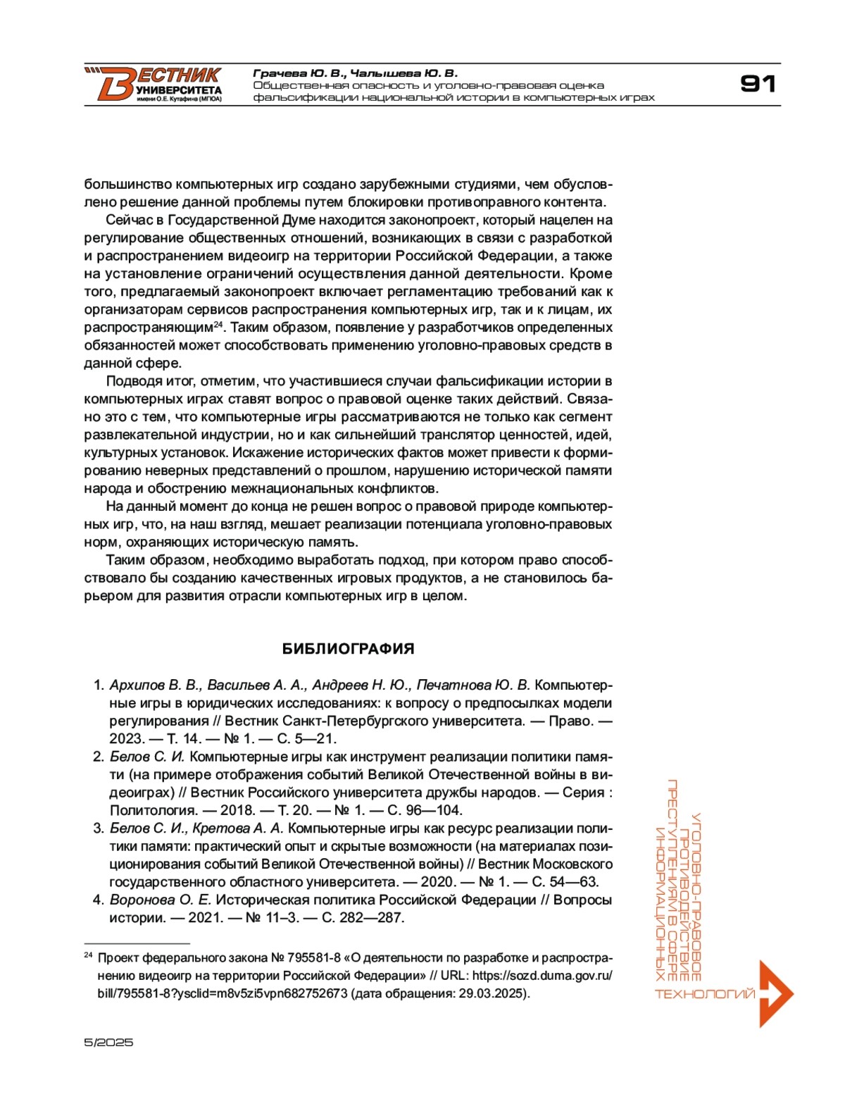 1. Архипов В. В., Васильев А. А., Андреев Н. Ю., Печатнова Ю. В. Компьютерные игры в юридических исследованиях: к вопросу о предпосылках модели регулирования // Вестник Санкт-Петербургского университета. - Право. - 2023. - Т. 14. - № 1. - С. 5-21.