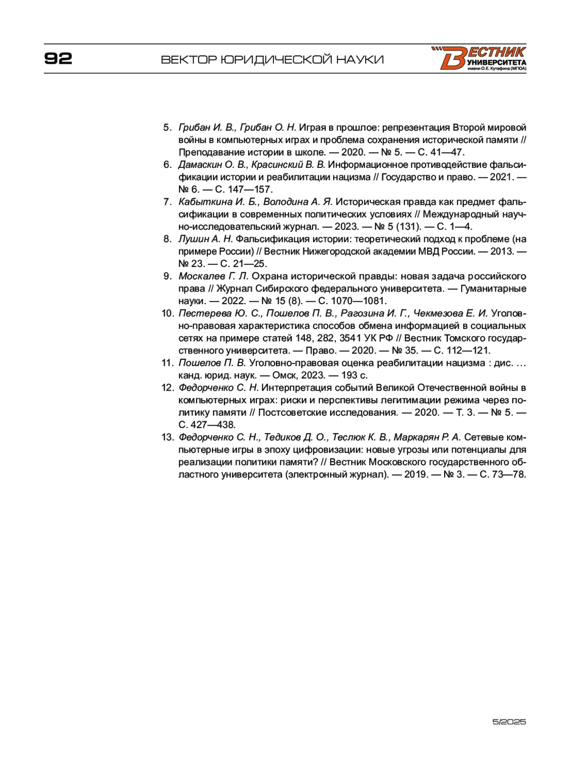 9. Москалев Г. Л. Охрана исторической правды: новая задача российского права // Журнал Сибирского федерального университета. - Гуманитарные науки. - 2022. - № 15 (8). - С. 1070-1081.