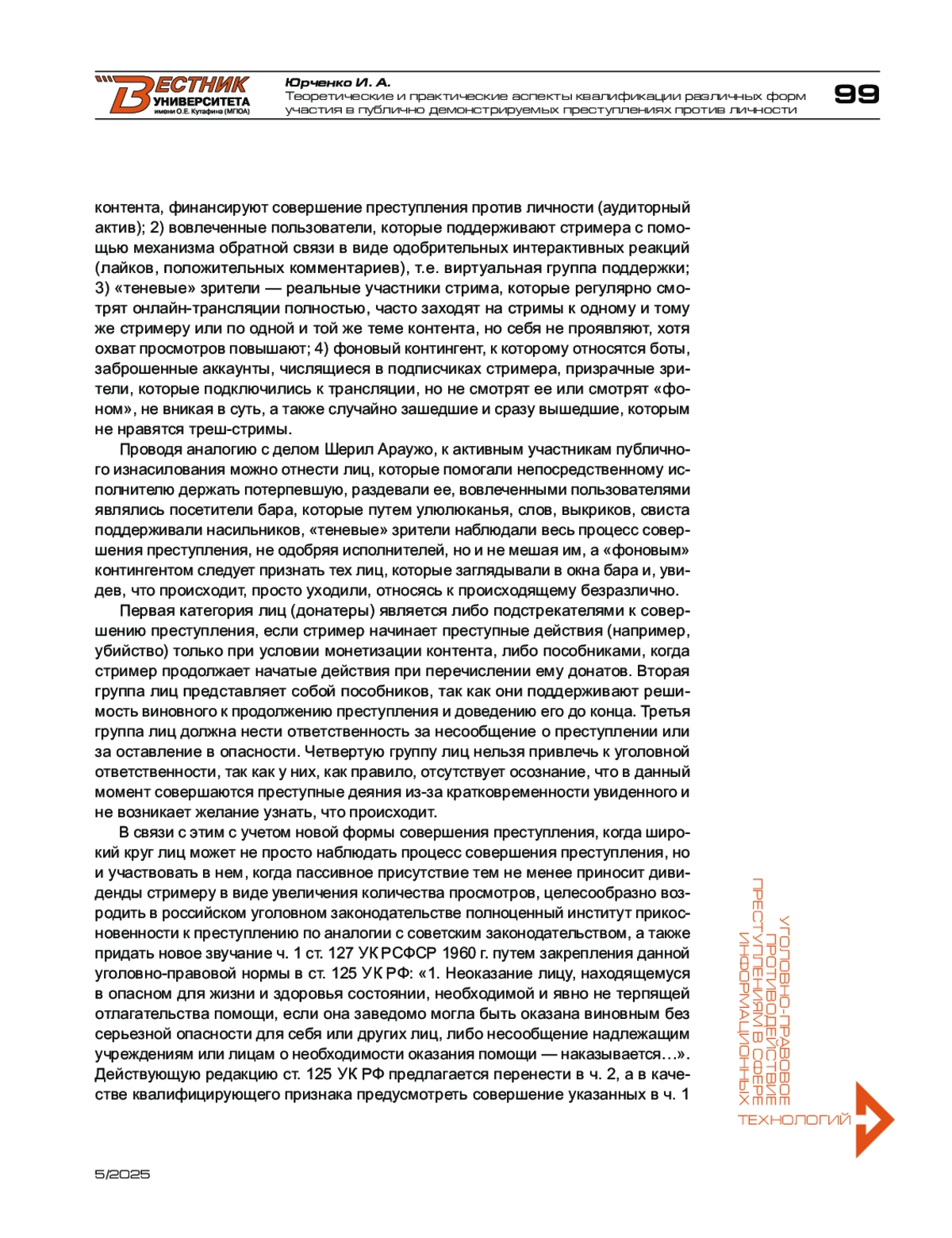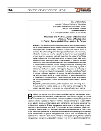 В статье разработаны концептуальные основы уголовно-правовой квалификации общественно опасных деяний зрителей онлайн-трансляций преступлений против личности. В структуре аудитории деструктивного контента, демонстрируемого в режиме реального времени, автором выделяются три группы лиц: активные спонсоры, интерактивные зрители и пассивные («теневые») наблюдатели. Делается вывод, что пользователи стриминговых сервисов, осуществляющие материальное стимулирование в форме донатов создателя запрещенного онлайн-контента, должны привлекаться к уголовной ответственности в качестве подстрекателей к преступлению; участники виртуальной трансляции преступления, проявляющие пользовательскую активность в виде положительной обратной связи, рассматриваемые как пособники общественно опасного посягательства, пассивных («теневых») наблюдателей, увеличивающих охват интернет-трансляций противоправных действий, необходимо наказывать в уголовно-правовом порядке за несообщение о преступлении против личности или за оставление в опасности. В настоящем исследовании предложено восстановить институт прикосновенности к преступлению в российском законодательстве, расширить субъектный состав уголовно-правовой нормы об оставлении в опасности, включить признак публичной демонстрации противоправных действий в ст. 125 УК РФ. Данные изменения направлены на повышение социальной ответственности граждан и предотвращение преступных посягательств против личности.