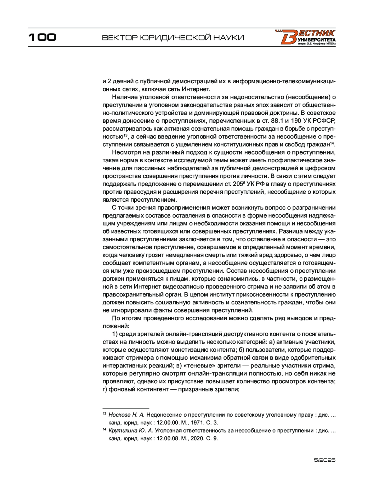 Для цитирования: Эстрин А. К вопросу о принципах построения системы уголовной репрессии1 в пролетарском государстве (Извлечение. Вестник Университета имени О. Е. Кутафина (МГЮА). 2025;(5):254-259.