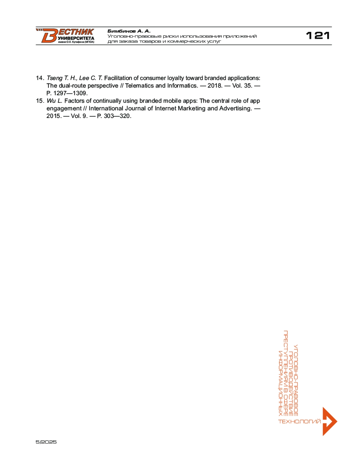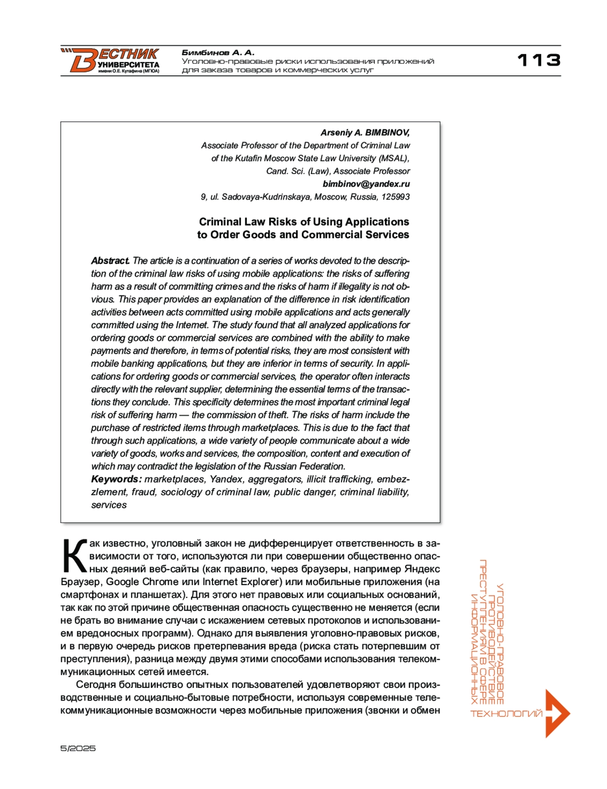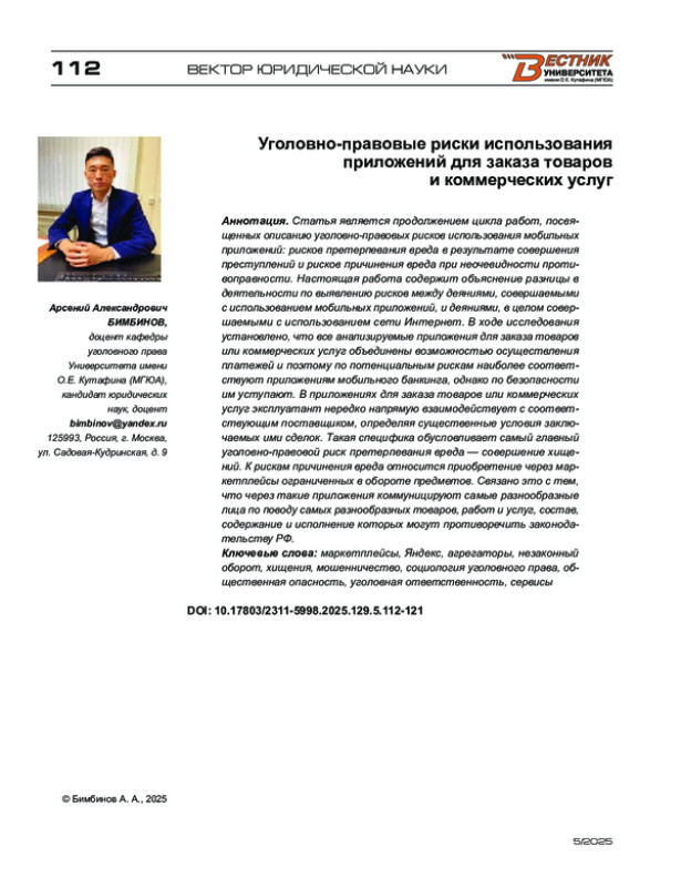 4. Bimbinov A. A. Criminal Prohibitions when Using Mobile Applications // Kutafin Law Review. - 2024. - Vol. 11. - No. 3. - P. 514-533. - https://doi.org/10.17803/2713-0533.2024.3.29.514-533.
