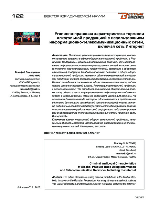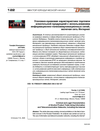 В статье рассматриваются существующие уголовно-правовые запреты в сфере оборота алкогольной продукции в Российской Федерации. Проведен анализ такого признака, как «использование информационно-телекоммуникационных сетей, включая сеть Интернет» при квалификации преступлений, связанных с оборотом алкогольной продукции. Наиболее опасными деяниями в сфере оборота алкогольной продукции является сбыт некачественной алкогольной продукции и сбыт алкогольной продукции несовершеннолетним. Именно эти деяния посягают на общественные отношения, подлежащие уголовно-правовой охране. Реализация алкогольной продукции с использованием ИТКС обладает повышенной общественной опасностью, однако в настоящее размещение информации о продаже алкоголя с использованием ИТКС не запрещено уголовным законом. На основании данного вывода автором обосновывается предложение изменить диспозицию исследуемой уголовно-правовой нормы, а также добавить в соответствующую часть квалифицирующий признак «с использованием средств массовой информации либо электронных или информационно-телекоммуникационных сетей (включая сеть Интернет)».