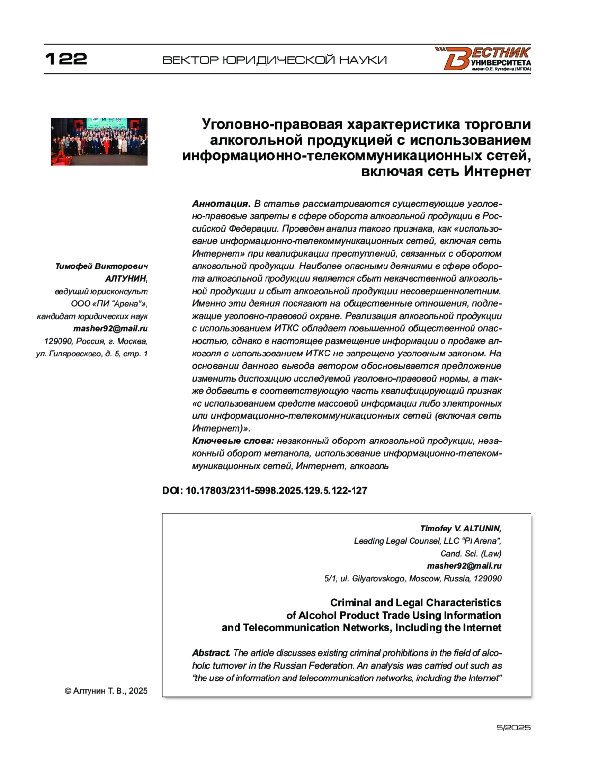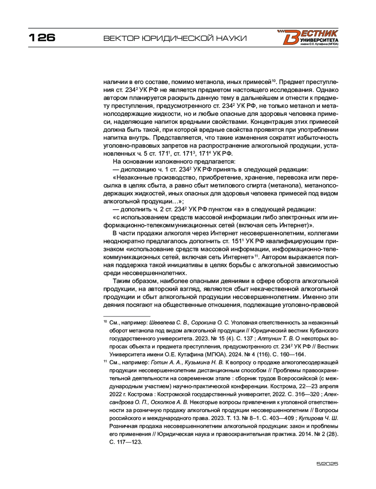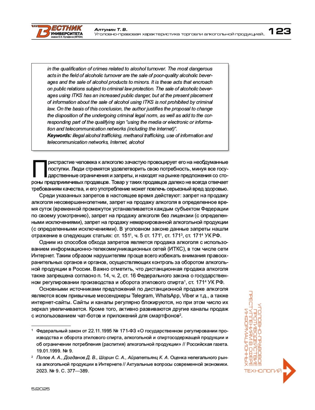 2. Алтунин Т. В. О некоторых вопросах объекта и предмета преступления, предусмотренного ст. 2342 УК РФ // Вестник Университета имени О.Е. Кутафина (МГЮА). - 2024. - № 4 (116). - С. 160-164.