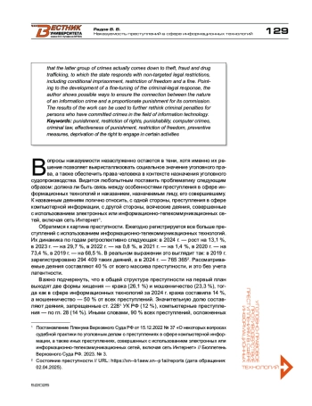 Статья посвящена проблеме справедливого, адекватного правоограничения лиц, совершивших уголовно-запрещенные деяния с использованием информационных технологий. Автор рассматривает криминологическую картину места и объема таких преступлений в структуре преступности, динамику и наиболее ярко выраженные случаи их совершения, каковыми признаются компьютерные и компьютеризированные преступления в классификации Е. А. Русскевича. Основываясь на обобщении массива судебной практики, автор показывает, что последняя группа преступлений фактически сводится к краже, мошенничеству и наркосбыту, на что государство реагирует нетаргетированными правоограничениями, в том числе условным лишением свободы, ограничением свободы и штрафом. Указывая на выстраивание тонкой настройки уголовно-правовой реакции, автор показывает возможные пути обеспечения связи между характером информационного преступления и соразмерной карой за его совершение. Результаты работы могут быть использованы для дальнейшего переосмысления уголовных наказаний лицам, совершившим преступления в сфере информационных технологий.