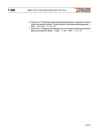 5. Честнов И. Л. Переосмысление юридической практики с позиций постклассической методологии права // Теоретическая и прикладная юриспруденция. - 2024. - № 1 (19). - С. 13-16.