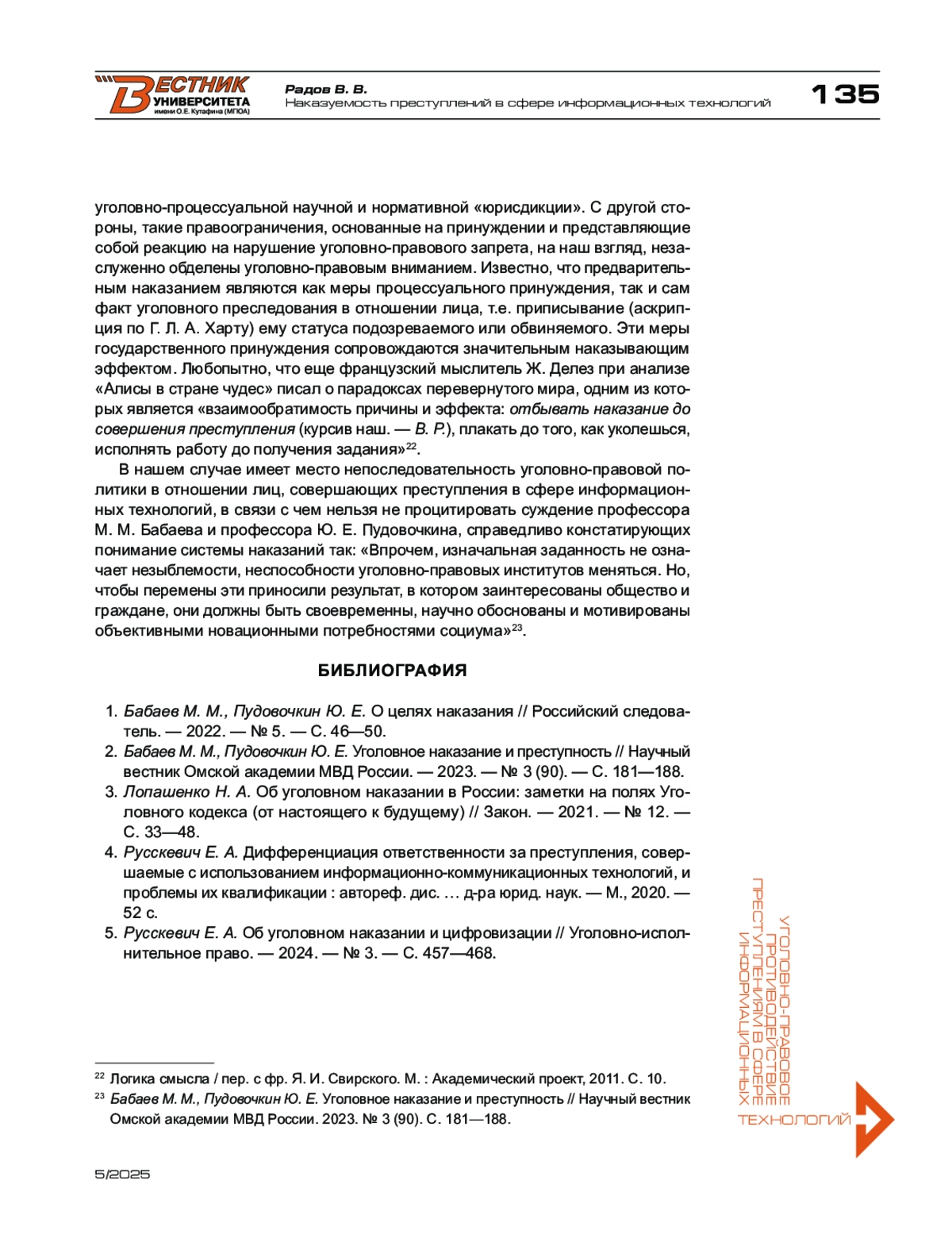 1. Бабаев М. М., Пудовочкин Ю. Е. О целях наказания // Российский следователь. - 2022. - № 5. - С. 46-50.