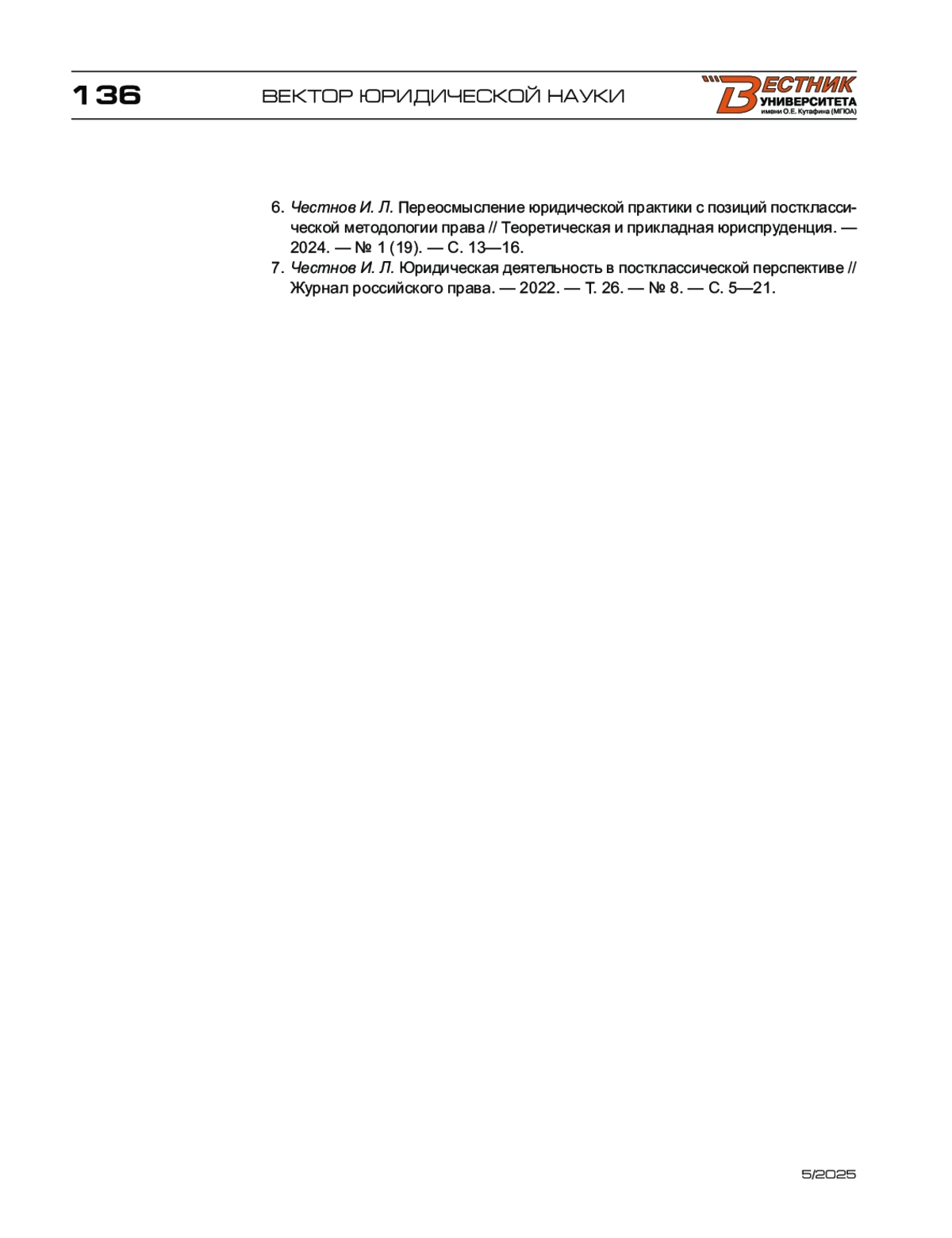 6. Честнов И. Л. Юридическая деятельность в постклассической перспективе // Журнал российского права. - 2022. - Т. 26. - № 8. - С. 5-21.