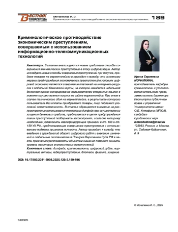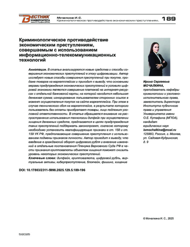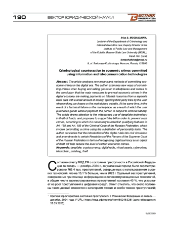 В статье анализируются новые средства и способы совершения экономических преступлений в эпоху цифровизации. Автор исследует новые способы совершения преступлений при покупке, продаже товаров на маркетплейсах и приходит к выводу, что основными мерами предупреждения экономических преступлений в условиях цифровой экономики являются совершение платежей на интернет-ресурсах с отдельной банковской карты, на которой находится небольшая денежная сумма; игнорирование пользователем сторонних ссылок в момент осуществления покупок на сайте маркетплейса. При этом в случае технического сбоя на маркетплейсе, в результате которого пользователь без оплаты приобретает товары, лицо подлежит уголовной ответственности. В статье обращается внимание на распространение использования технологии дипфейк при осуществлении хищения денежных средств, предлагается в целях предупреждения таких преступлений поддержать законопроект, согласно которому необходимо установить квалифицирующие признаки в ст. 158 и ст. 159 УК РФ, предполагающие совершение преступления с использованием подмены признаков личности. Автор приходит к выводу, что введение в гражданский оборот цифрового рубля и внесение изменений в отдельные постановления Пленума Верховного Суда РФ в части признания криптовалюты объектом хищения поможет снизить уровень некоторых экономических преступлений.