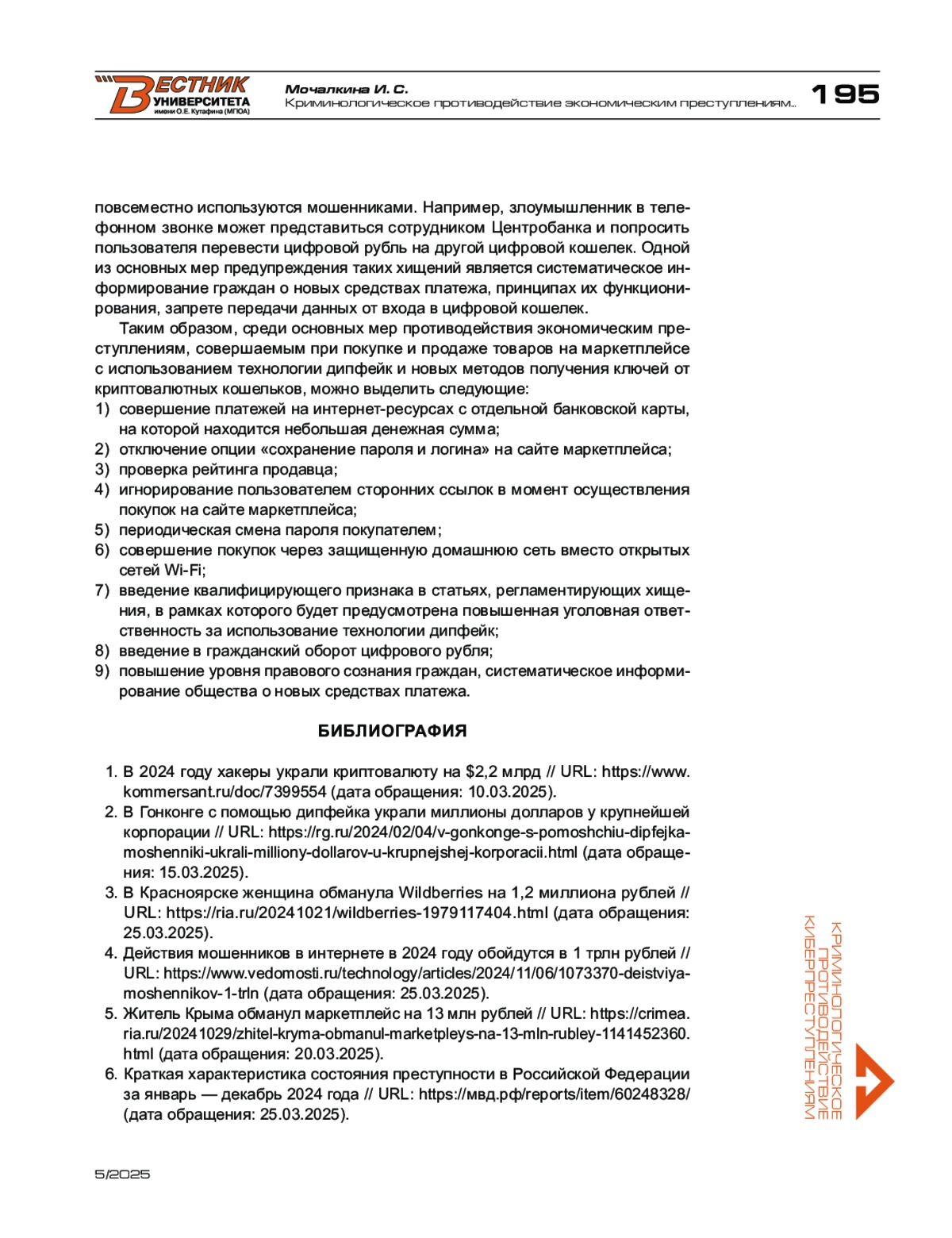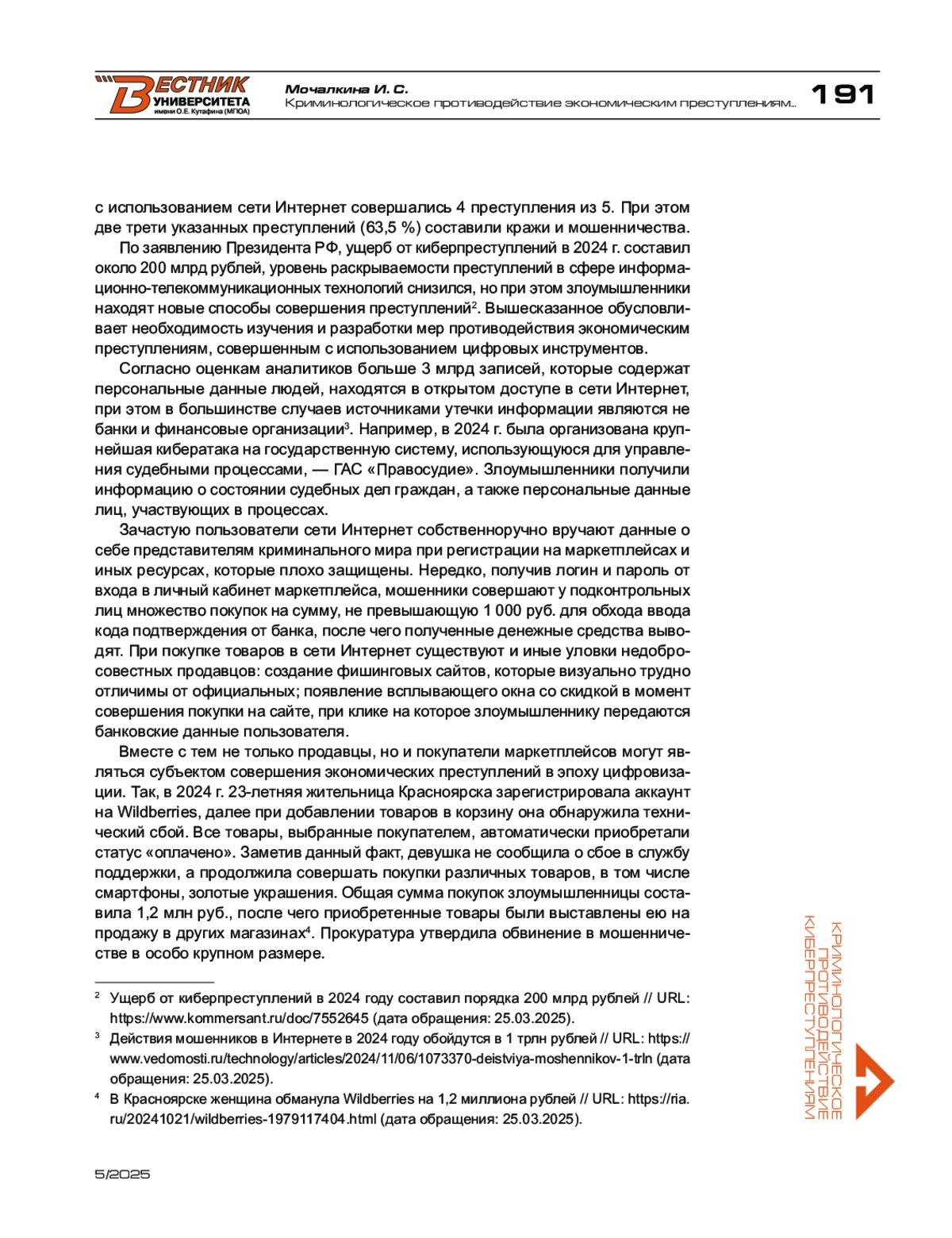 4. Действия мошенников в интернете в 2024 году обойдутся в 1 трлн рублей // URL: https://www.vedomosti.ru/technology/articles/2024/11/06/1073370-deistviyamoshennikov-1-trln (дата обращения: 25.03.2025).