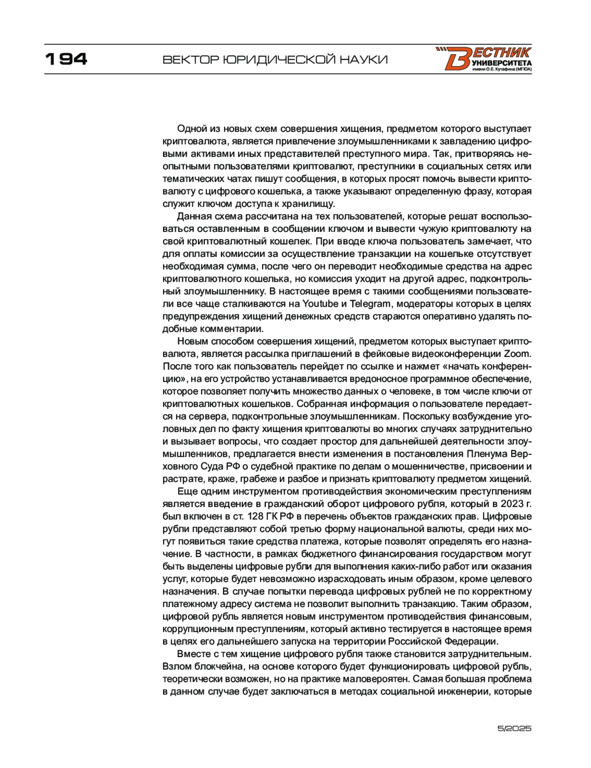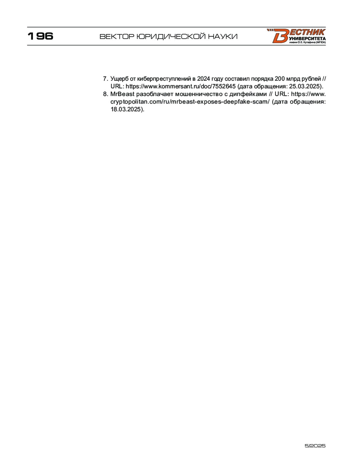 7. Ущерб от киберпреступлений в 2024 году составил порядка 200 млрд рублей // URL: https://www.kommersant.ru/doc/7552645 (дата обращения: 25.03.2025).