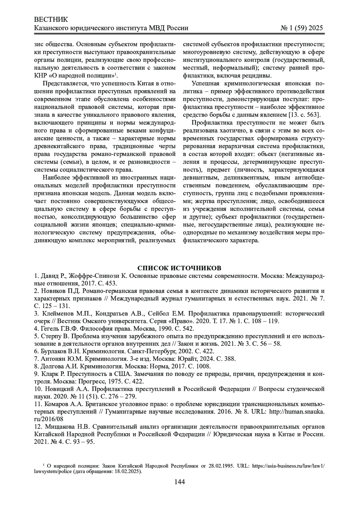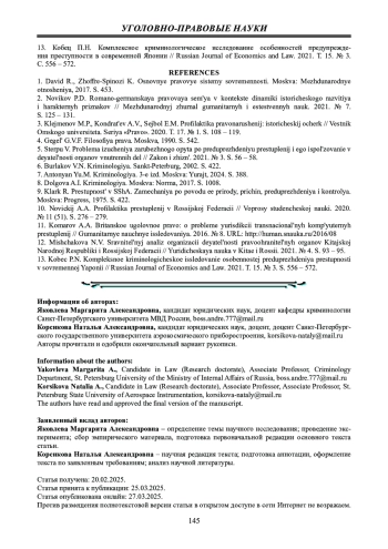 13. 	Кобец П.Н. Комплексное криминологическое исследование особенностей предупреждения преступности в современной Японии // Russian Journal of Economics and Law. 2021. Т. 15. № 3. С. 556 - 572. ;. DOI: 10.21202/2782-2923.2021.3.556-572 EDN: FQGCNP