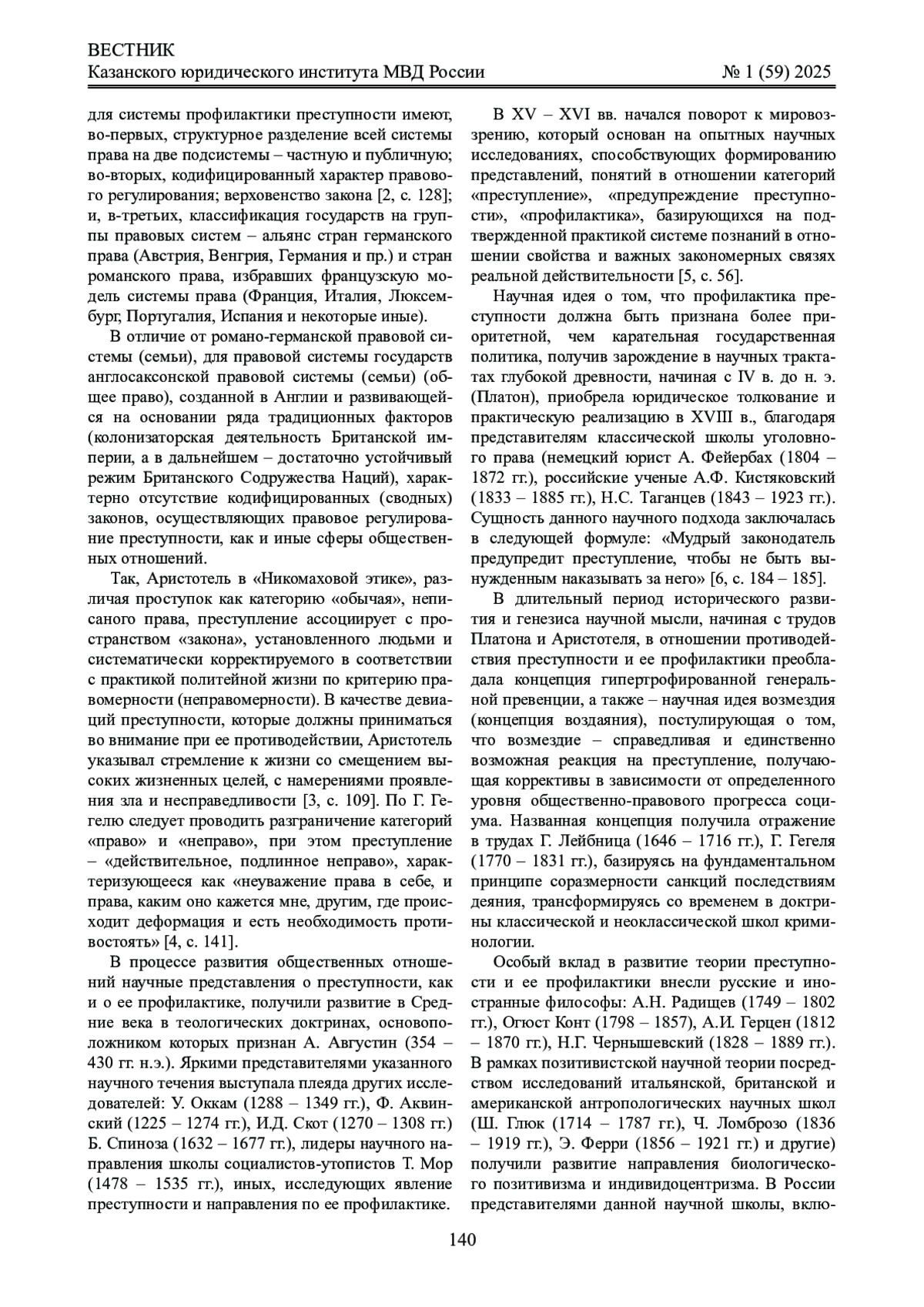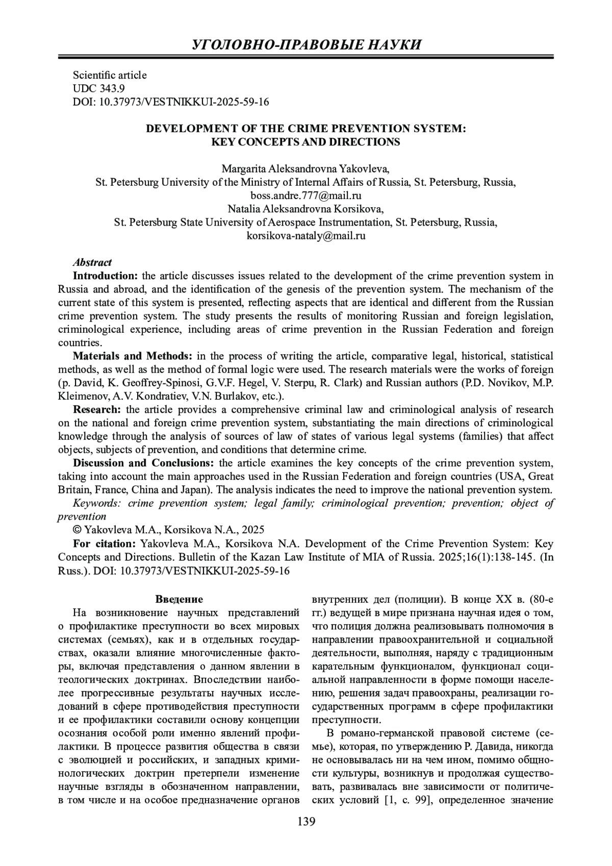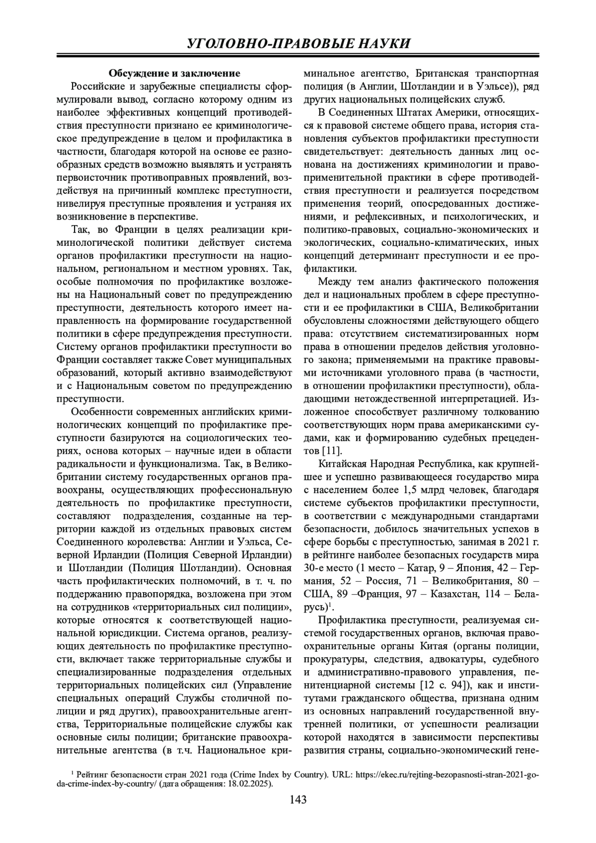 Обсуждение и заключение: в статье рассмотрены ключевые концепции системы профилактики преступности с учетом основных подходов, применяемых в Российской Федерации и зарубежных странах (США, Великобритании, Франции, Китая и Японии). Проведенный анализ свидетельствует о необходимости совершенствования национальной системы превенции.