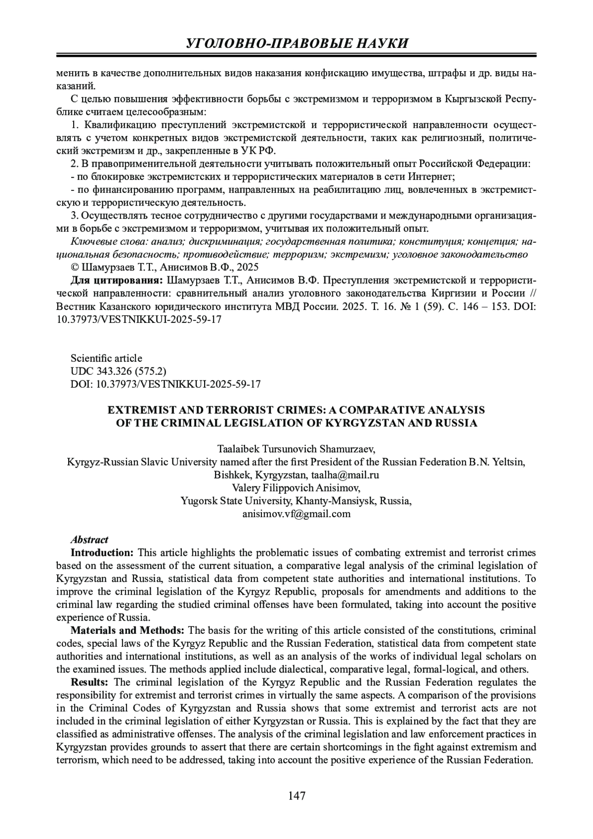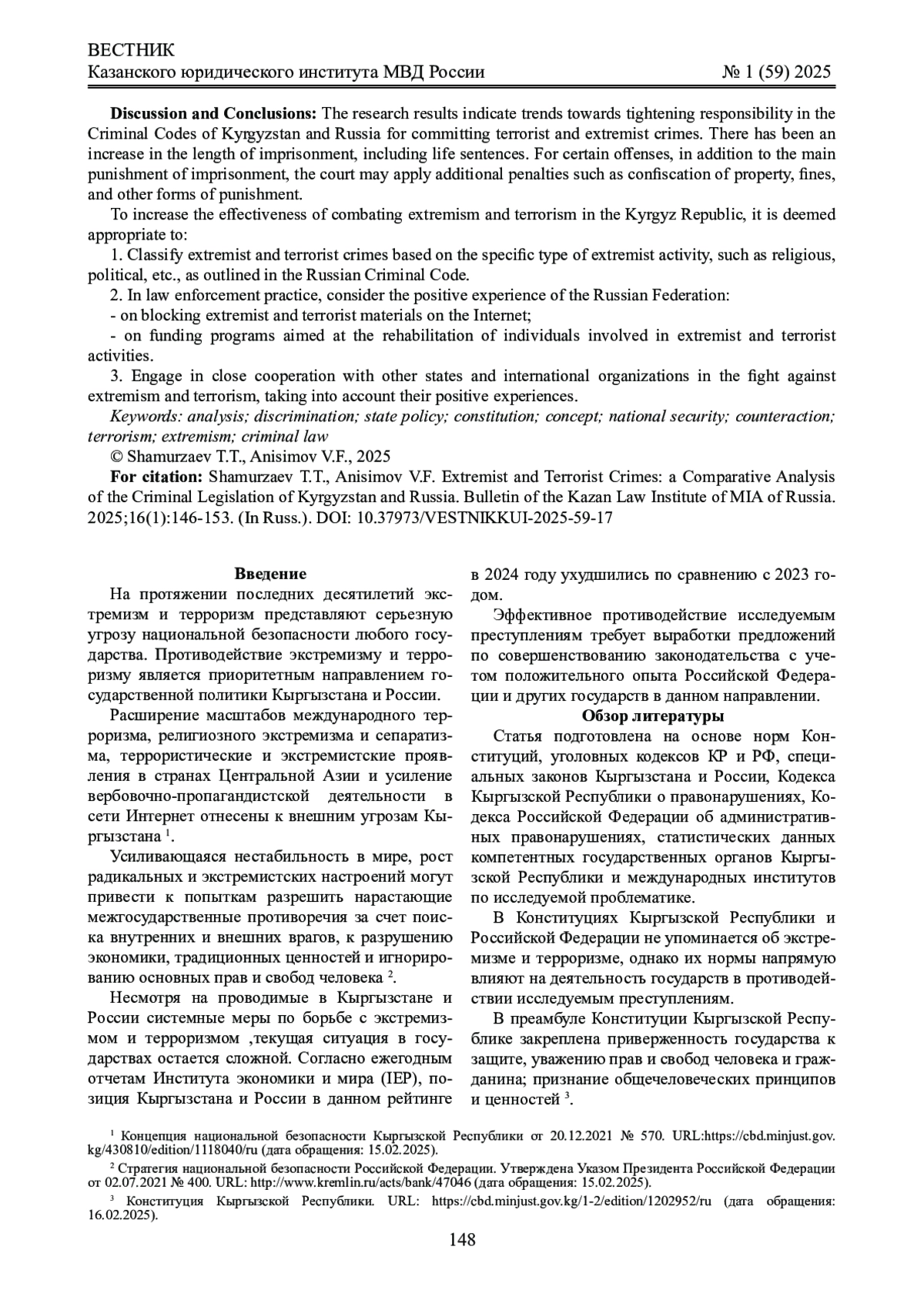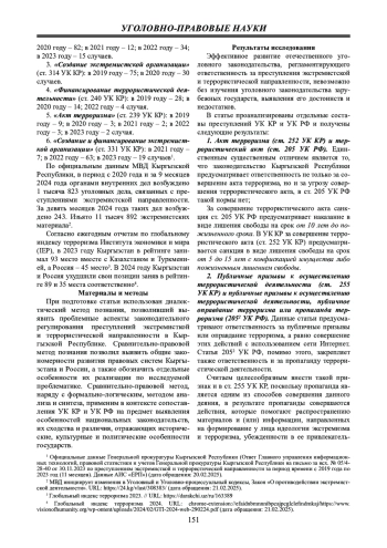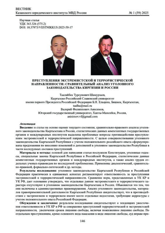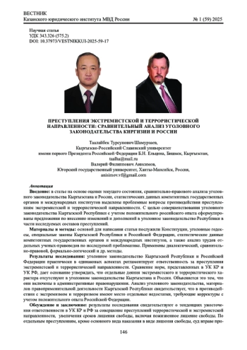 Введение: в статье на основе оценки текущего состояния, сравнительно-правового анализа уголовного законодательства Кыргызстана и России, статистических данных компетентных государственных органов и международных институтов выделены проблемные вопросы противодействия преступлениям экстремистской и террористической направленности. С целью совершенствования уголовного законодательства Кыргызской Республики с учетом положительного российского опыта сформулированы предложения по внесению изменений и дополнений в уголовное законодательство Республики в части исследуемых составов преступлений.