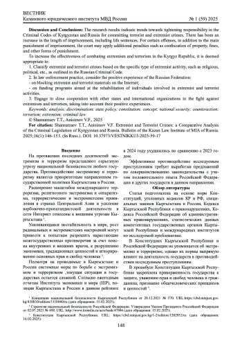 Обсуждение и заключение: результаты исследования свидетельствуют о тенденциях ужесточения ответственности в УК КР и РФ за совершение преступлений террористической и экстремистской направленности, увеличения сроков лишения свободы, включая пожизненное лишение свободы. По отдельным преступлениям, кроме основного вида наказания в виде лишения свободы, суд вправе применить в качестве дополнительных видов наказания конфискацию имущества, штрафы и др. виды наказаний. С целью повышения эффективности борьбы с экстремизмом и терроризмом в Кыргызской Республике считаем целесообразным: 1. Квалификацию преступлений экстремистской и террористической направленности осуществлять с учетом конкретных видов экстремистской деятельности, таких как религиозный, политический экстремизм и др., закрепленные в УК РФ. 2. В правоприменительной деятельности учитывать положительный опыт Российской Федерации: - по блокировке экстремистских и террористических материалов в сети Интернет; - по финансированию программ, направленных на реабилитацию лиц, вовлеченных в экстремистскую и террористическую деятельность. 3. Осуществлять тесное сотрудничество с другими государствами и международными организациями в борьбе с экстремизмом и терроризмом, учитывая их положительный опыт.