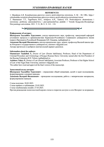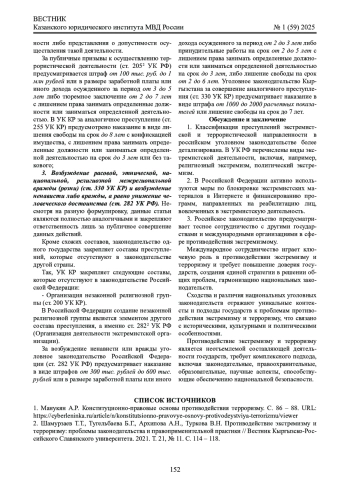 2. 	Шамурзаев Т.Т., Тугельбаева Б.Г., Архипова А.Н., Туркова В.Н. Противодействие экстремизму и терроризму: проблемы законодательства и правоприменительной практики // Вестник Кыргызско-Российского Славянского университета. 2021. Т. 21, № 11. С. 114 - 118. EDN: TDSSGA
