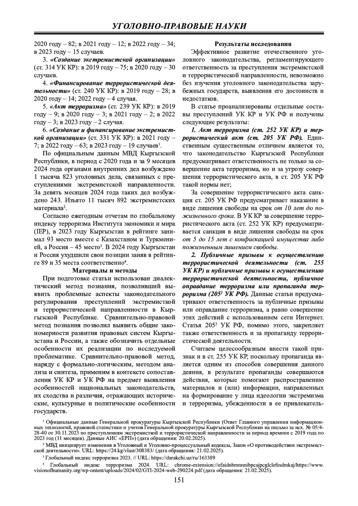 Материалы и методы: основой для написания статьи послужили Конституции, уголовные rодексы, специальные законы Кыргызской Республики и Российской Федерации, статистические данные компетентных государственных органов и международных институтов, а также анализ трудов отдельных ученых-правоведов по исследуемой проблематике. Применены диалектический, сравнительно-правовой, формально-логический и др. методы.