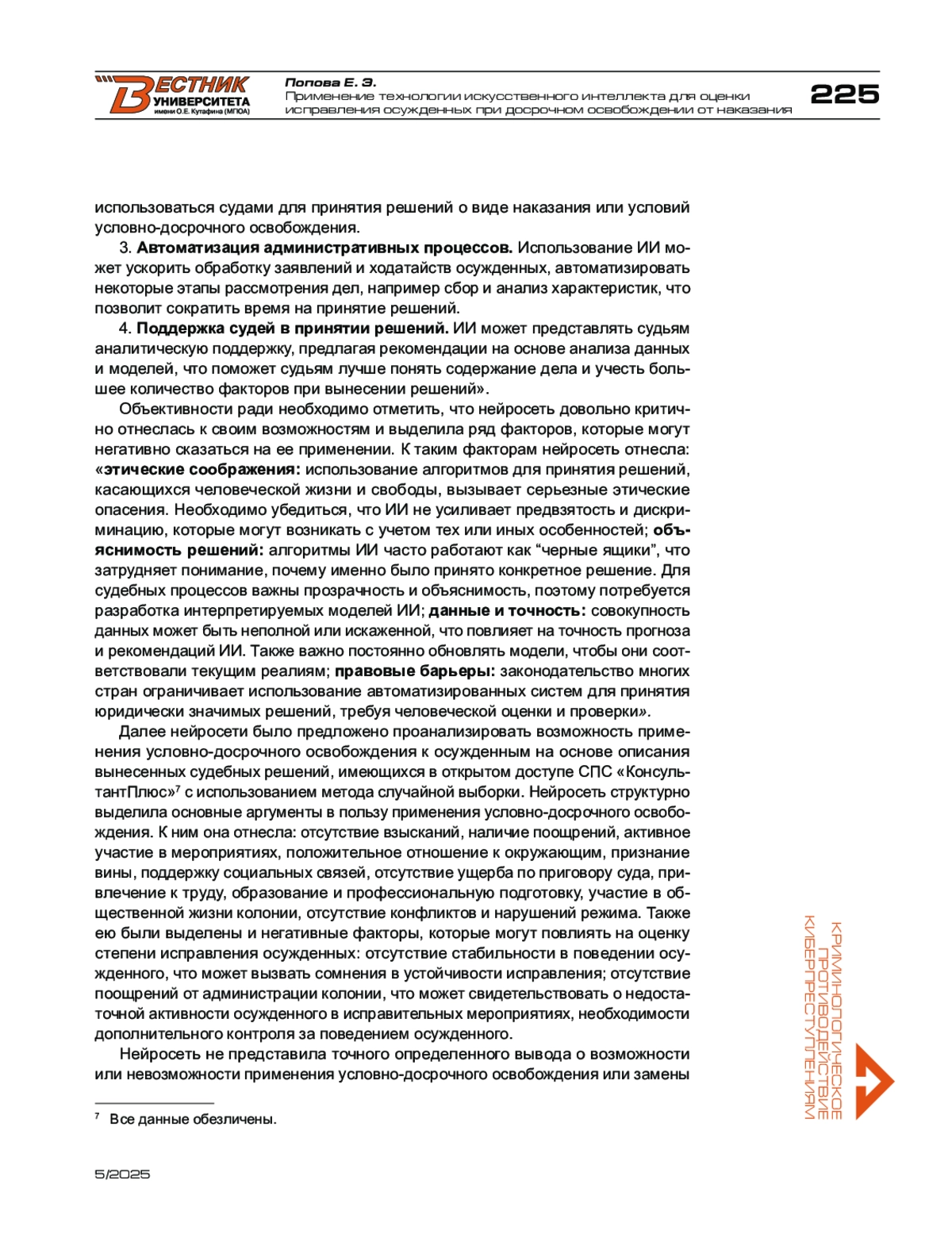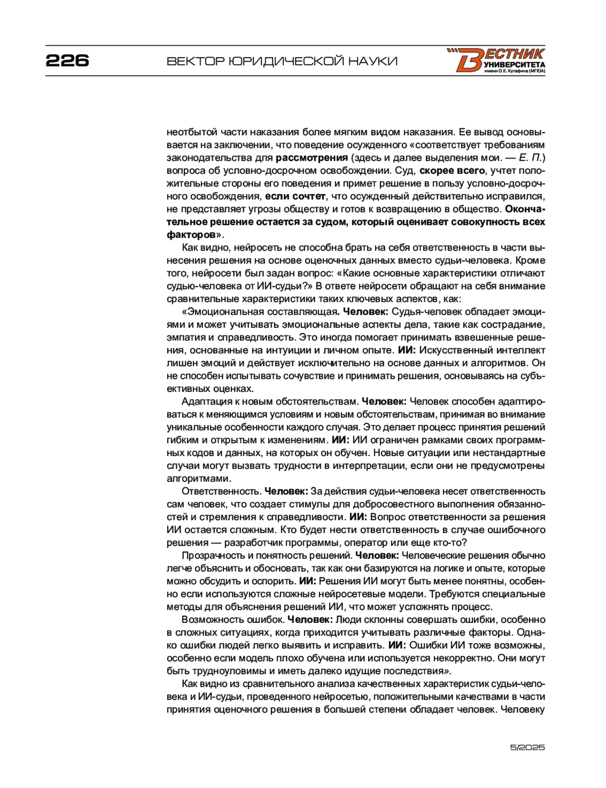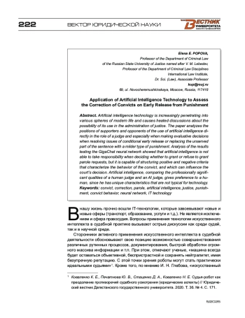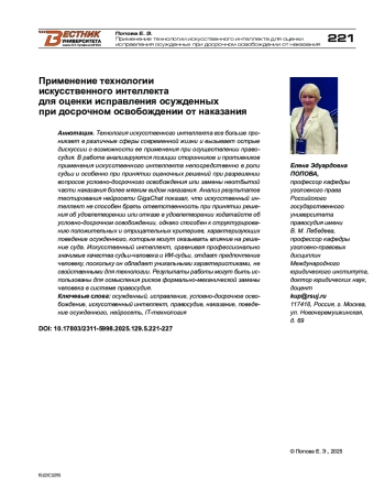 Технология искусственного интеллекта все больше проникает в различные сферы современной жизни и вызывает острые дискуссии о возможности ее применения при осуществлении правосудия. В работе анализируются позиции сторонников и противников применения искусственного интеллекта непосредственно в роли судьи и особенно при принятии оценочных решений при разрешении вопросов условно-досрочного освобождения или замены неотбытой части наказания более мягким видом наказания. Анализ результатов тестирования нейросети GigaChat показал, что искусственный интеллект не способен брать ответственность при принятии решения об удовлетворении или отказе в удовлетворении ходатайств об условно-досрочном освобождении, однако способен к структурированию положительных и отрицательных критериев, характеризующих поведение осужденного, которые могут оказывать влияние на решение суда. Искусственный интеллект, сравнивая профессионально значимые качества судьи-человека и ИИ-судьи, отдает предпочтение человеку, поскольку он обладает уникальными характеристиками, не свойственными для технологии. Результаты работы могут быть использованы для осмысления рисков формально-механической замены человека в системе правосудия.