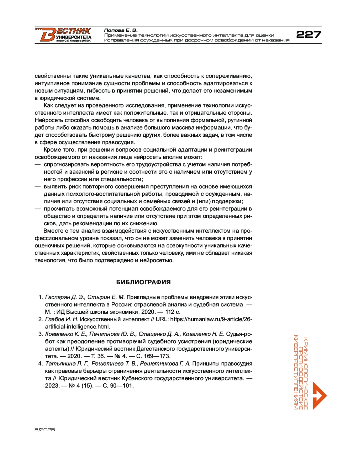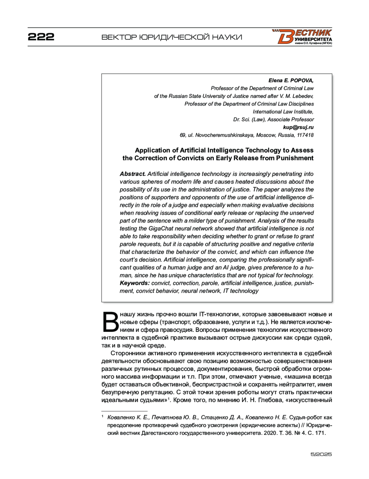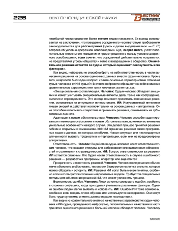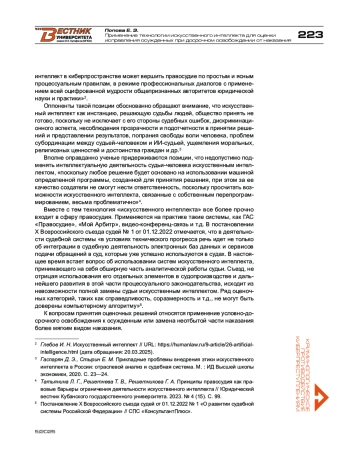 3. Коваленко К. Е., Печатнова Ю. В., Стаценко Д. А., Коваленко Н. Е. Судья-робот как преодоление противоречий судебного усмотрения (юридические аспекты) // Юридический вестник Дагестанского государственного университета. - 2020. - Т. 36. - № 4. - С. 169-173.