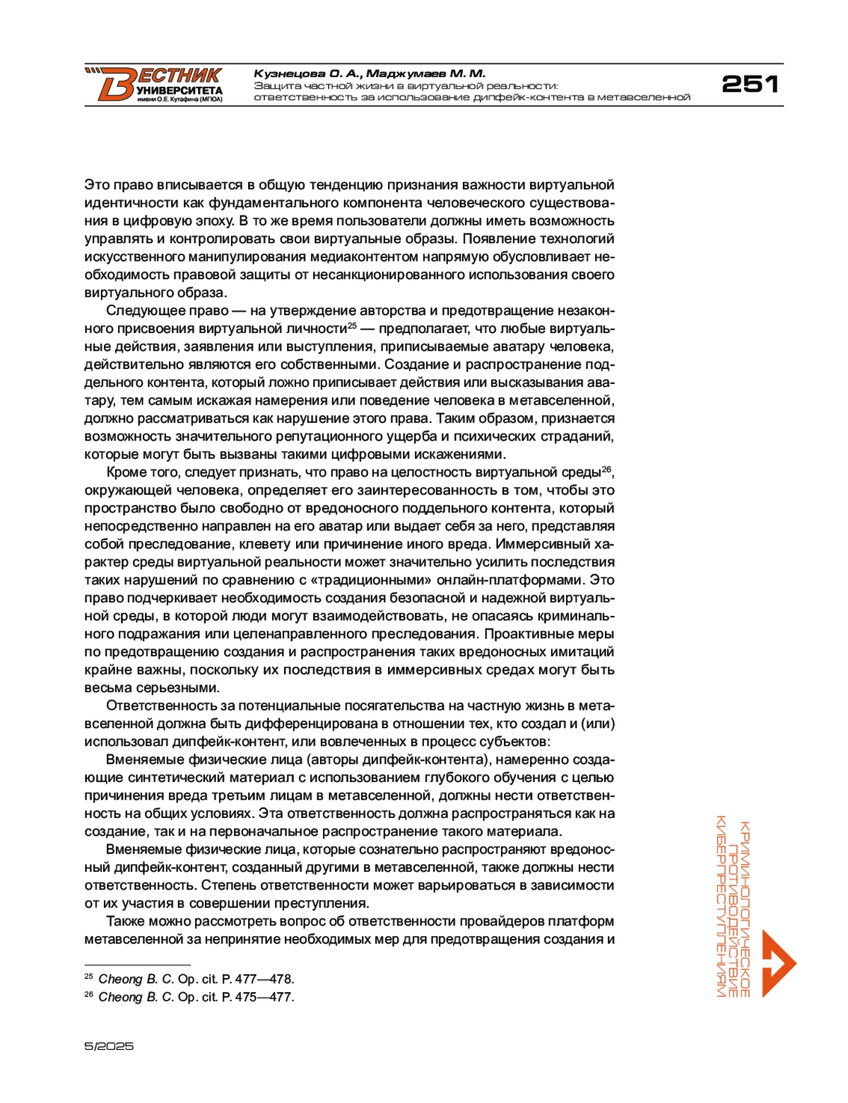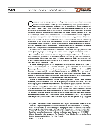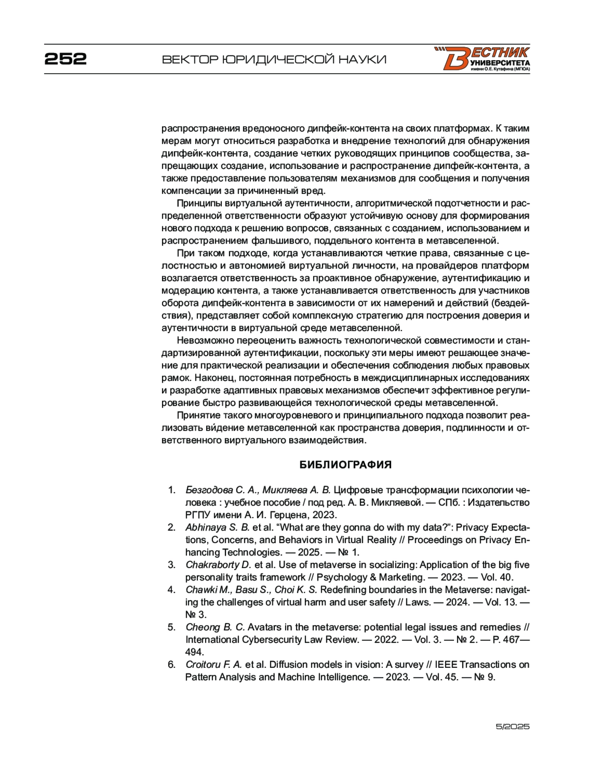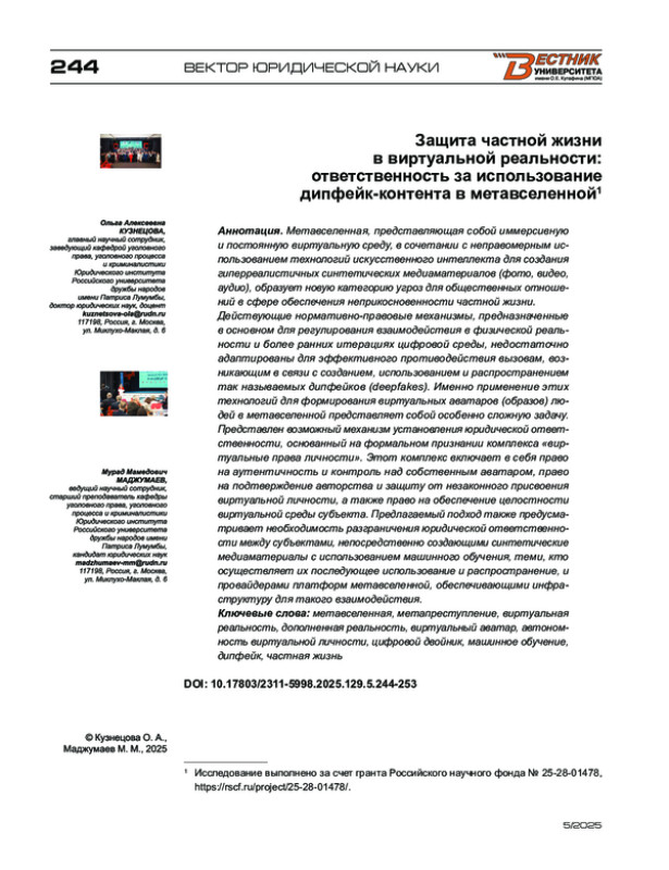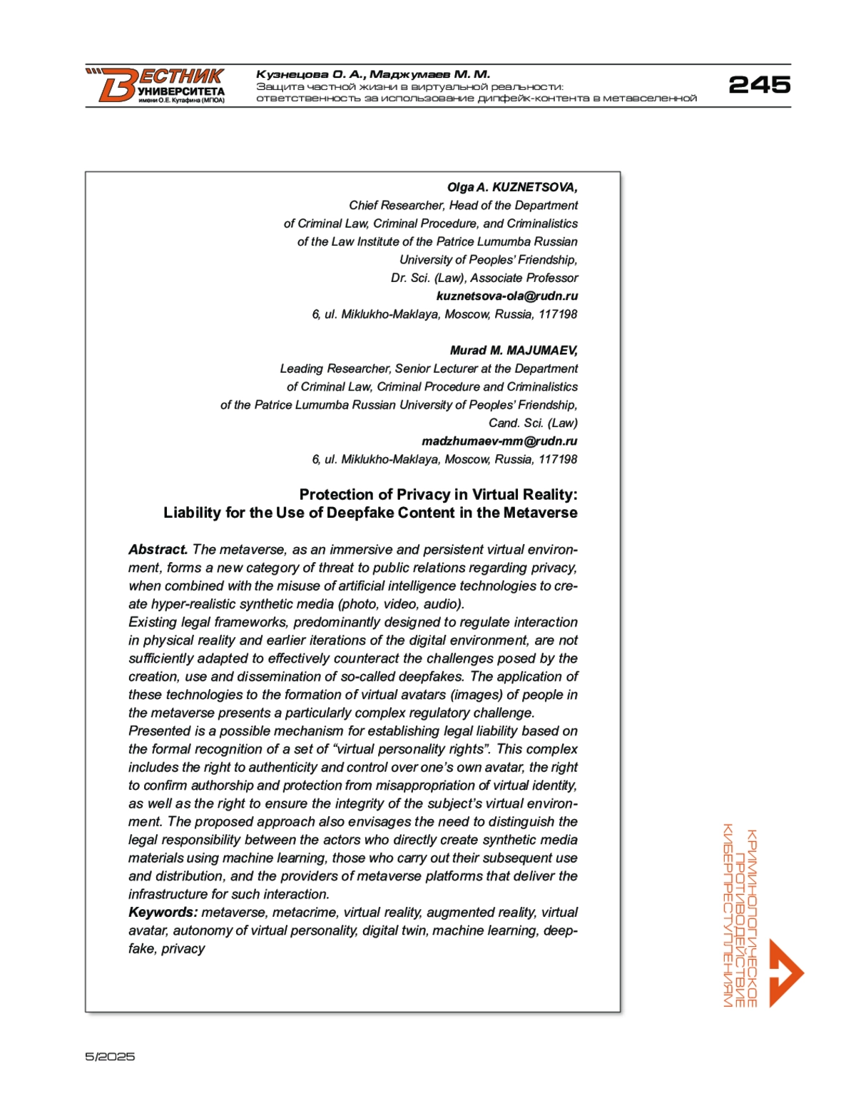 Действующие нормативно-правовые механизмы, предназначенные в основном для регулирования взаимодействия в физической реальности и более ранних итерациях цифровой среды, недостаточно адаптированы для эффективного противодействия вызовам, возникающим в связи с созданием, использованием и распространением так называемых дипфейков (deepfakes). Именно применение этих технологий для формирования виртуальных аватаров (образов) людей в метавселенной представляет собой особенно сложную задачу. Представлен возможный механизм установления юридической ответственности, основанный на формальном признании комплекса «виртуальные права личности». Этот комплекс включает в себя право на аутентичность и контроль над собственным аватаром, право на подтверждение авторства и защиту от незаконного присвоения виртуальной личности, а также право на обеспечение целостности виртуальной среды субъекта. Предлагаемый подход также предусматривает необходимость разграничения юридической ответственности между субъектами, непосредственно создающими синтетические медиаматериалы с использованием машинного обучения, теми, кто осуществляет их последующее использование и распространение, и провайдерами платформ метавселенной, обеспечивающими инфраструктуру для такого взаимодействия.