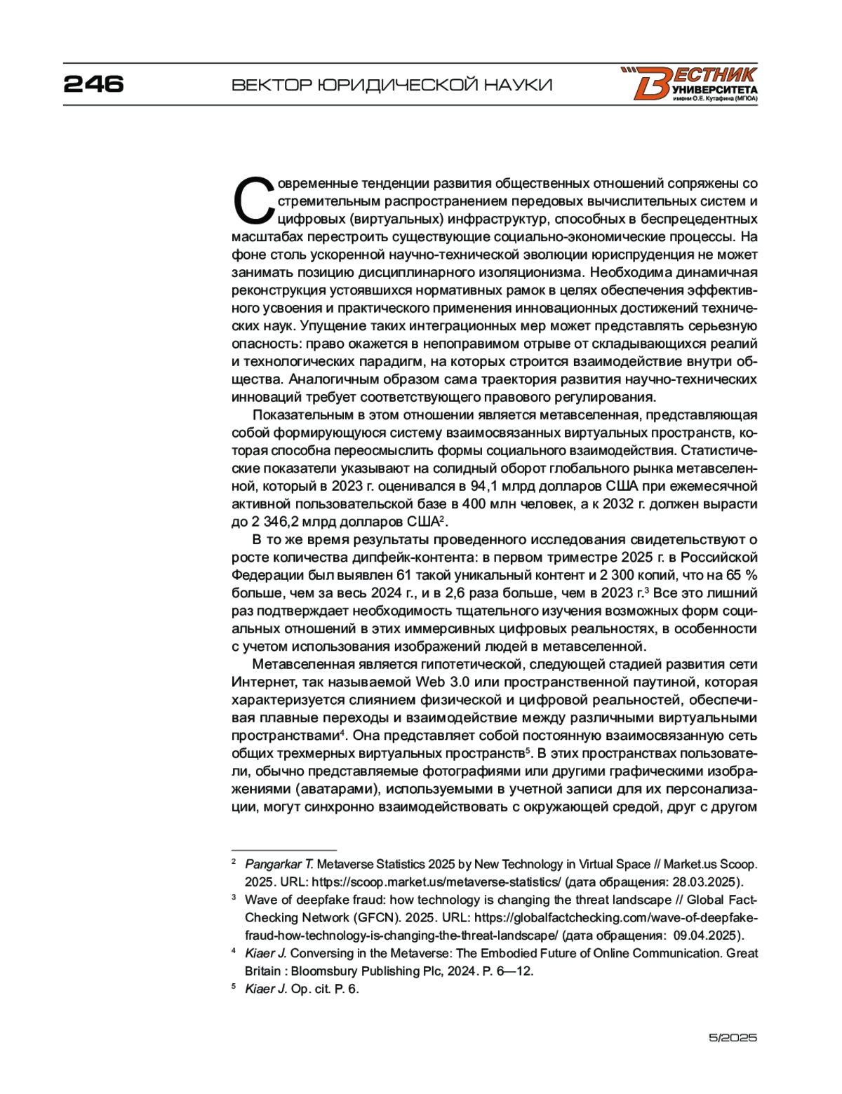 14. Seo S., Seok B., Lee C. Digital forensic investigation framework for the metaverse // Journal of Supercomputing. - 2023. - Vol. 79. - № 9. - P. 9467-9468. 15. Van der Sloot B. Regulating the synthetic society: Generative AI, legal questions, and societal challenges. - Great Britain: Bloomsbury Publishing Plc, 2024. - P. 45-46.