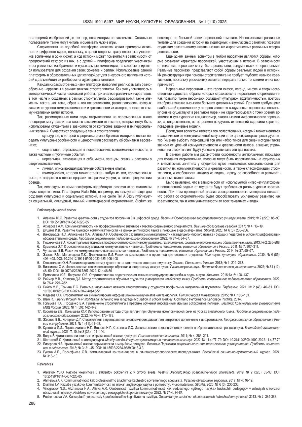 10. 	Винникова О.А. Использование сторителлинга при обучении иностранному языку в вузах. Гуманитарные науки. Вестник Финансового университета. 2022; № S1 (12): 48-50. С-48-50. DOI: 10.26794/2226-7867-2022-12- EDN: FBVCXK
