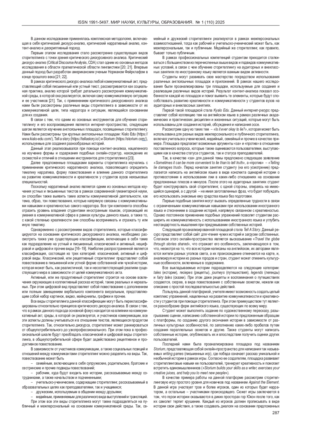 Данное исследование посвящено тому, как использование англоязычных площадок, применяемых для реализации сторителлинга, помогает развитию коммуникативности и креативности у студентов вузов неязыковых специальностей при изучении английского языка как иностранного. В рамках данной работы было проанализировано три крупных англоязычных сайта, посвященных созданию и распространению историй - Kialo Edu, Tell a Story и Storium, а также рассмотрены различные виды сторителлинга в зависимости от реализуемых в них коммуникативных и нарративных аспектов. В качестве методов исследования были применены критический дискурс-анализ, контент-анализ и критический нарративный анализ. Результаты исследования показали, что разнообразные площадки и виды сторителлинга требуют от студентов различного уровня использования креативности. При этом было доказано, что работа со сторителлингом и предназначенными для этого площадками способствует усиленному развитию коммуникативности и креативности студентов.