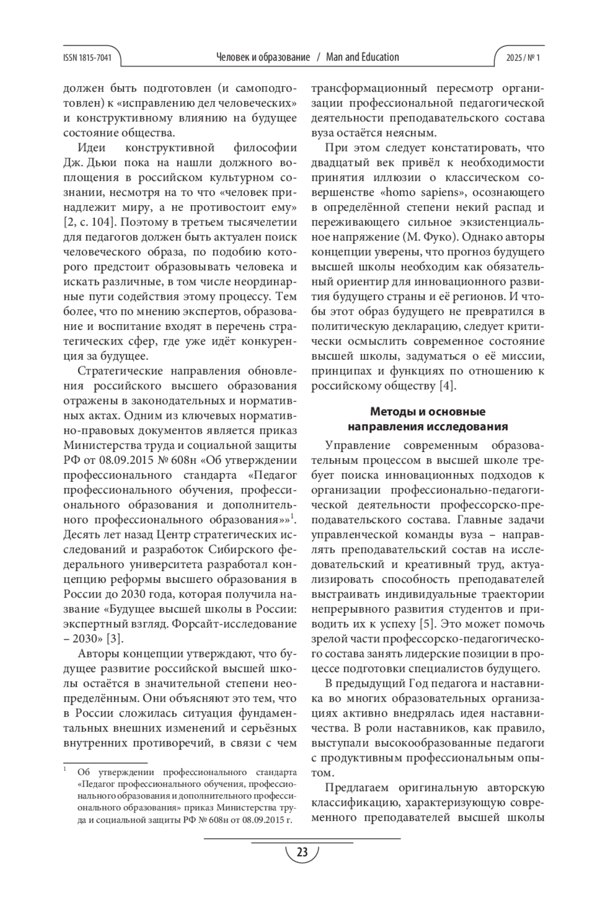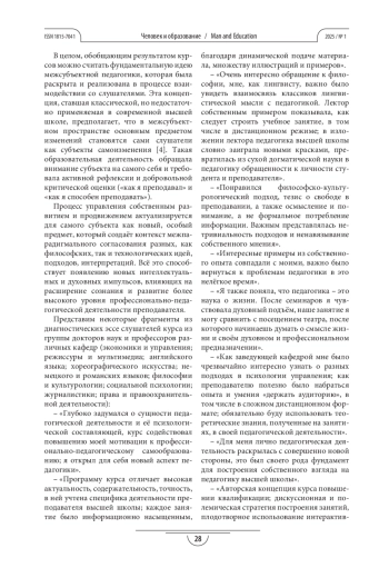 Статья посвящена актуальным вопросам модернизации профессионально-педагогической деятельности преподавателей высшей школы в условиях современных социально-культурных реалий. Анализируется кризисное состояние отечественного высшего образования и раскрываются причины, его обусловливающие. Опираясь на нормативно-правовые акты и прогностические концепции реформирования высшего образования в России, автор рассматривает концептуальный переход от «педагогики знаний» к «педагогике деятельности и проектирования» и к «педагогике культуры». Особое внимание уделяется феномену социальной неопределённости, проявляющемуся в фундаментальных внешних изменениях и внутренних противоречиях, как существенному фактору развития высшего образования. В статье также представлены основные условия и пути формирования стратегических ориентиров для развития преподавателя высшей школы как подлинного субъекта своей профессионально-педагогической деятельности. Автор предлагает оригинальную классификацию современных преподавателей-наставников, включающую модели преподавателя-мастера, преподавателя-инноватора, преподавателя-творца и преподавателя-автора. Также представлена программа дополнительного профессионального образования для повышения квалификации преподавателей высшей школы, охватывающая современные аспекты профессионально-педагогической деятельности в контексте межсубъектной педагогики. Результативным блоком усвоения содержания программы являются диагностические эссе, комплекс эвристических и опережающих вопросов для обсуждения заявленной тематики, а также контент-проекты авторских концепций преподавания и подготовки специалистов для современной России.