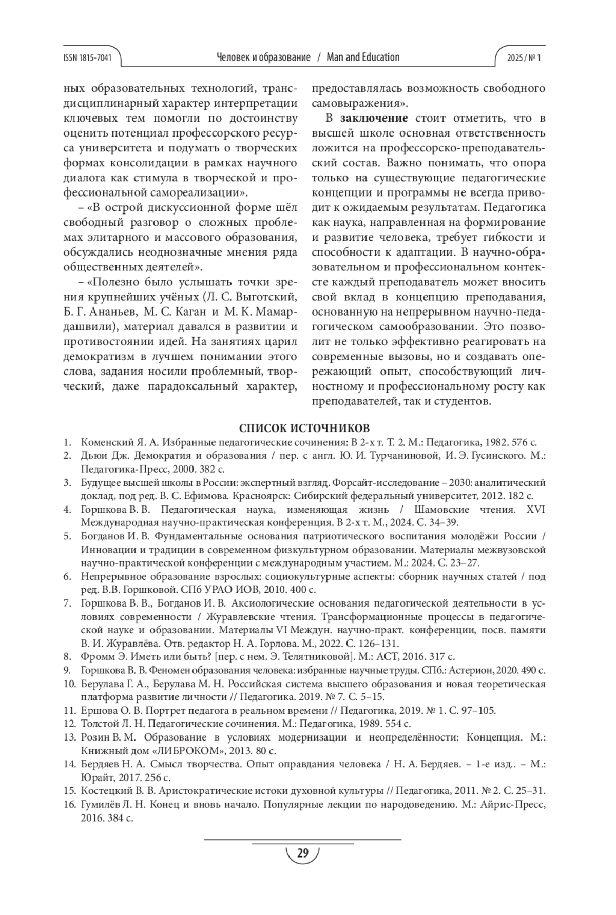 10. Берулава Г. А., Берулава М. Н. Российская система высшего образования и новая теоретическая платформа развитие личности // Педагогика. 2019. № 7. С. 5-15.