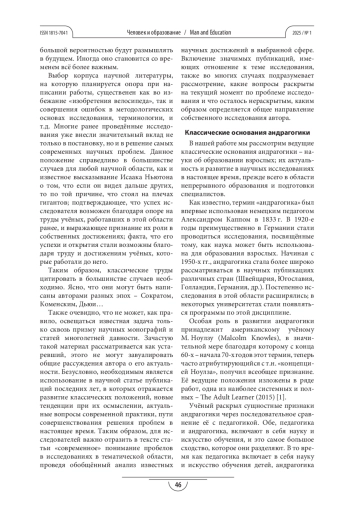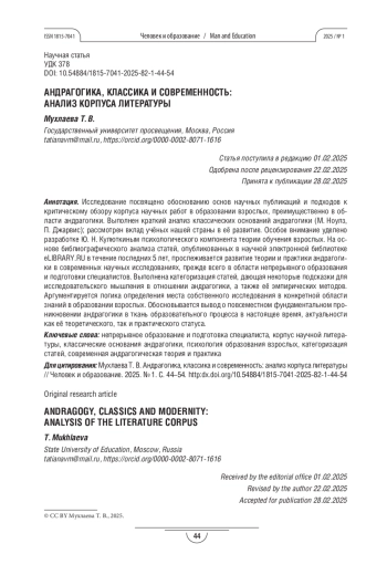 Исследование посвящено обоснованию основ научных публикаций и подходов к критическому обзору корпуса научных работ в образовании взрослых, преимущественно в области андрагогики. Выполнен краткий анализ классических оснований андрагогики (М. Ноулз, П. Джарвис); рассмотрен вклад учёных нашей страны в её развитие. Особое внимание уделено разработке Ю. Н. Кулюткиным психологического компонента теории обучения взрослых. На основе библиографического анализа статей, опубликованных в научной электронной библиотеке eLIBRARY. RU в течение последних 5 лет, прослеживается развитие теории и практики андрагогики в современных научных исследованиях, прежде всего в области непрерывного образования и подготовки специалистов. Выполнена категоризация статей, дающая некоторые подсказки для исследовательского мышления в отношении андрагогики, а также её эмпирических методов. Аргументируется логика определения места собственного исследования в конкретной области знаний в образовании взрослых. Обосновывается вывод о повсеместном фундаментальном проникновении андрагогики в ткань образовательного процесса в настоящее время, актуальности как её теоретического, так и практического статуса.
