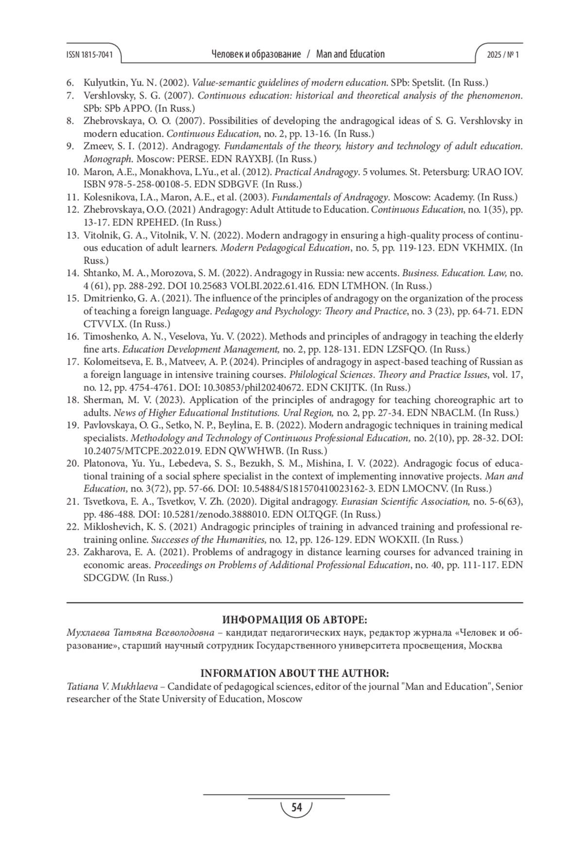13. Витольник Г. А., Витольник В. Н. Современная андрагогика в обеспечении качественного процесса непрерывного образования взрослых обучающихся // Современное педагогическое образование. 2022. № 5. С. 119-123. EDN: VKHMIX.