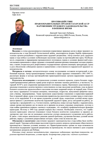 Введение: в статье рассматривается изменение нормативных правовых актов в сфере трудового законодательства в годы Великой Отечественной войны, анализируются формы борьбы правоохранительных органов республики с нарушителями трудовой дисциплины. Автор отмечает роль трудового права в годы войны в условиях мобилизации населения страны на противодействие врагу. Необходимость сохранения и наращивания промышленного потенциала страны в условиях фашистской агрессии вызвала применение в сфере трудовых отношений административно-командных методов управления, а значит, возрастала роль репрессивных государственных органов (милиции, прокуратуры, судов) в деле обеспечения соблюдения законов и привлечения к ответственности нарушителей трудового законодательства.