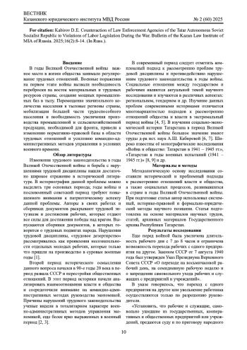 Материалы и методы: методологическую основу исследования составили исторический и проблемный подходы. Автор проанализировал изменения в сфере трудовых отношений в 1941-1945 гг., рассмотрел формы и методы противодействия правоохранительных органов нарушениям трудового законодательства.