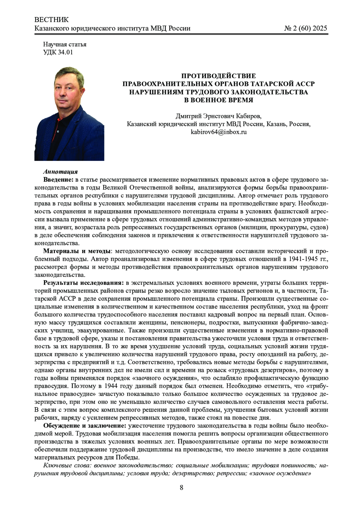 Результаты исследования: в экстремальных условиях военного времени, утраты больших территорий промышленных районов страны резко возросло значение тыловых регионов и, в частности, Татарской АССР в деле сохранения промышленного потенциала страны. Произошли существенные социальные изменения в количественном и качественном составе населения республики, уход на фронт большого количества трудоспособного населения поставил кадровый вопрос на первый план. Основную массу трудящихся составляли женщины, пенсионеры, подростки, выпускники фабрично-заводских училищ, эвакуированные. Также произошли существенные изменения в нормативно-правовой базе в трудовой сфере, указы и постановления правительства ужесточили условия труда и ответственность за их нарушения. В то же время ухудшение условий труда, социальных условий жизни трудящихся привело к увеличению количества нарушений трудового права, росту опозданий на работу, дезертирства с предприятий и т. д. Соответственно, требовались новые методы борьбы с нарушителями, однако органы внутренних дел не имели сил и времени на розыск «трудовых дезертиров», поэтому в годы войны применялся порядок «заочного осуждения», что ослабляло профилактическую функцию правосудия. Поэтому в 1944 году данный порядок был отменен. Необходимо отметить, что «трибунальное правосудие» зачастую показывало только большое количество осужденных за трудовое дезертирство, при этом оно не уменьшало количество случаев самовольного оставления места работы. В связи с этим вопрос комплексного решения данной проблемы, улучшения бытовых условий жизни рабочих, наряду с усилением репрессивных методов, также стоял на повестке дня.