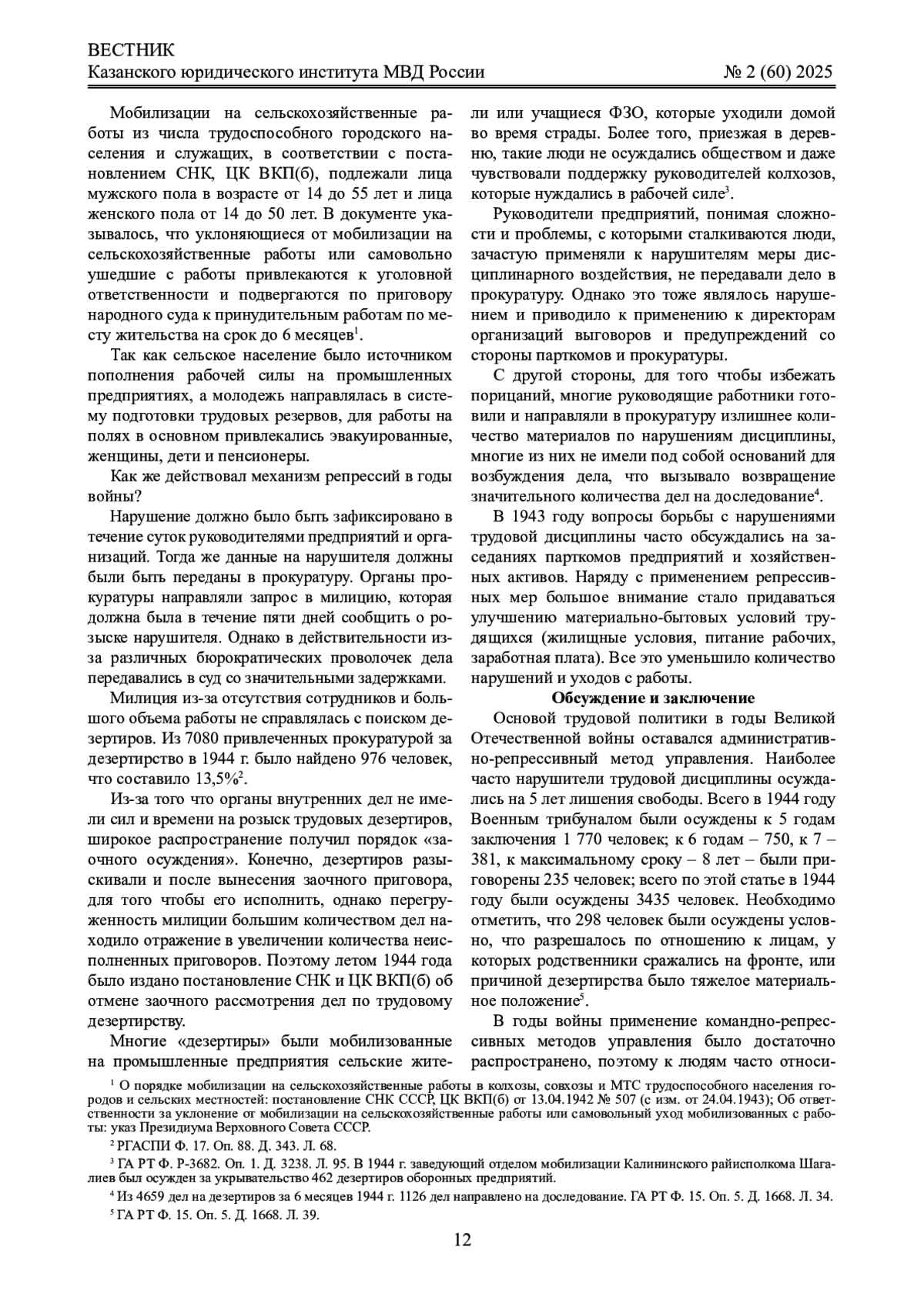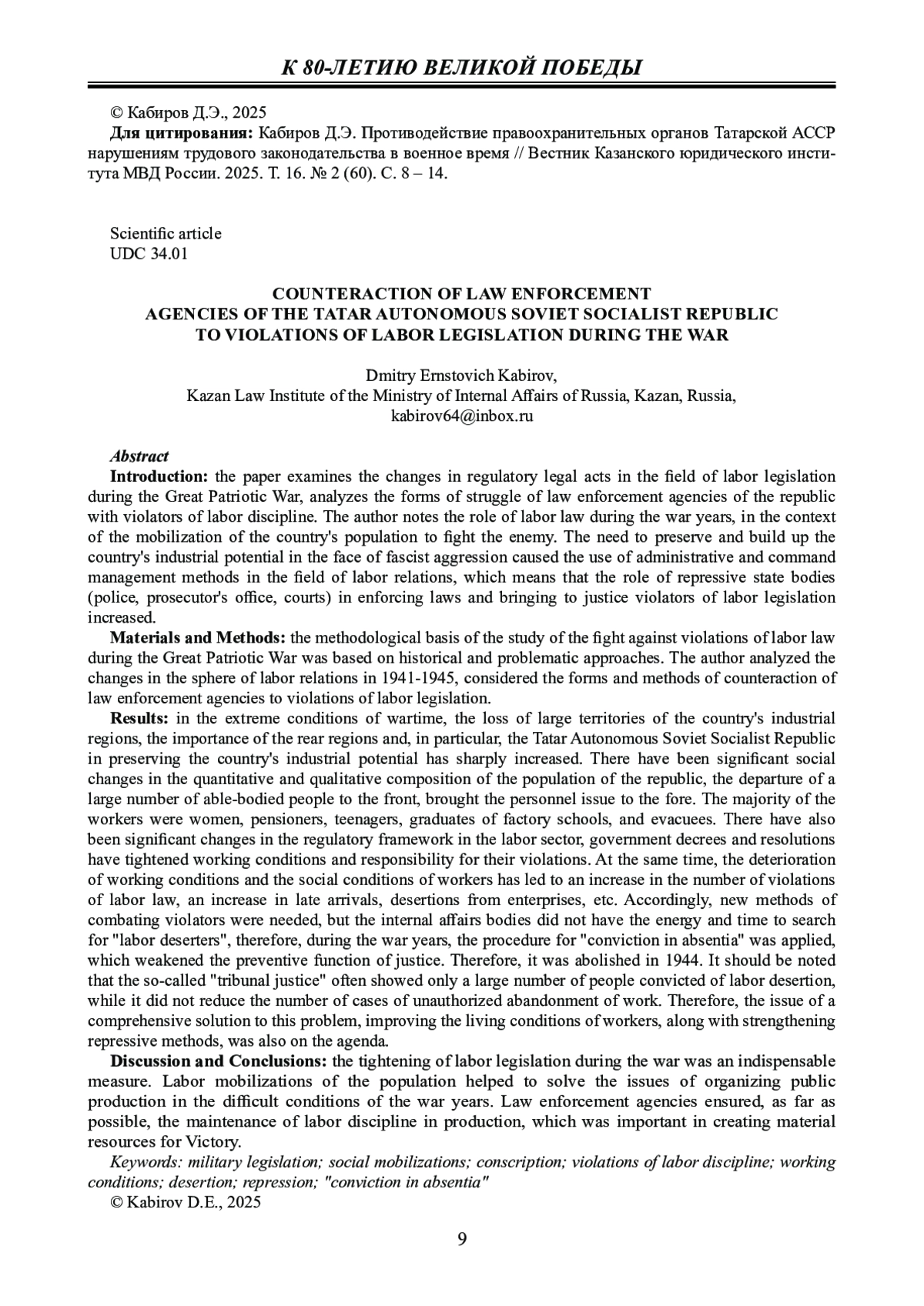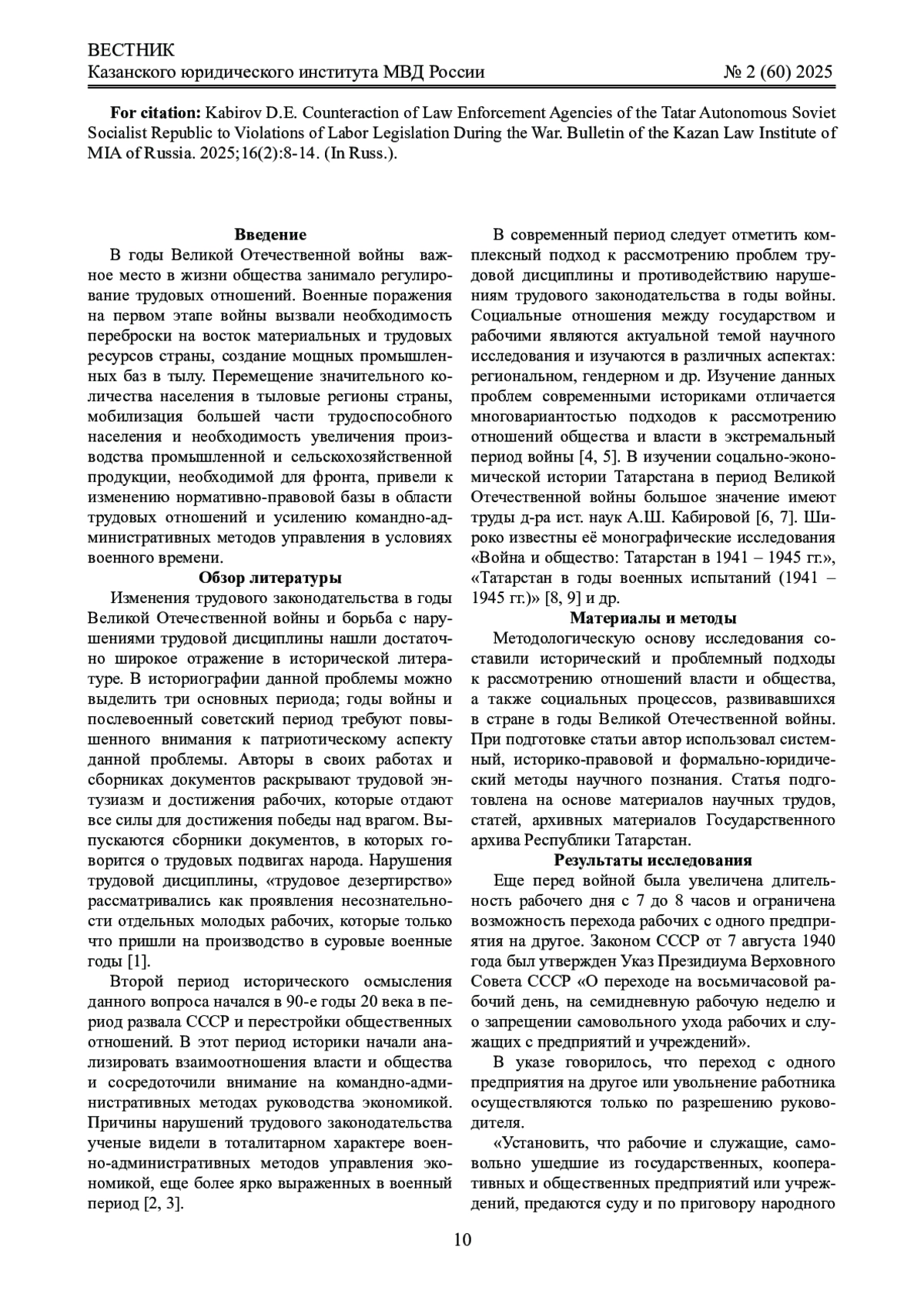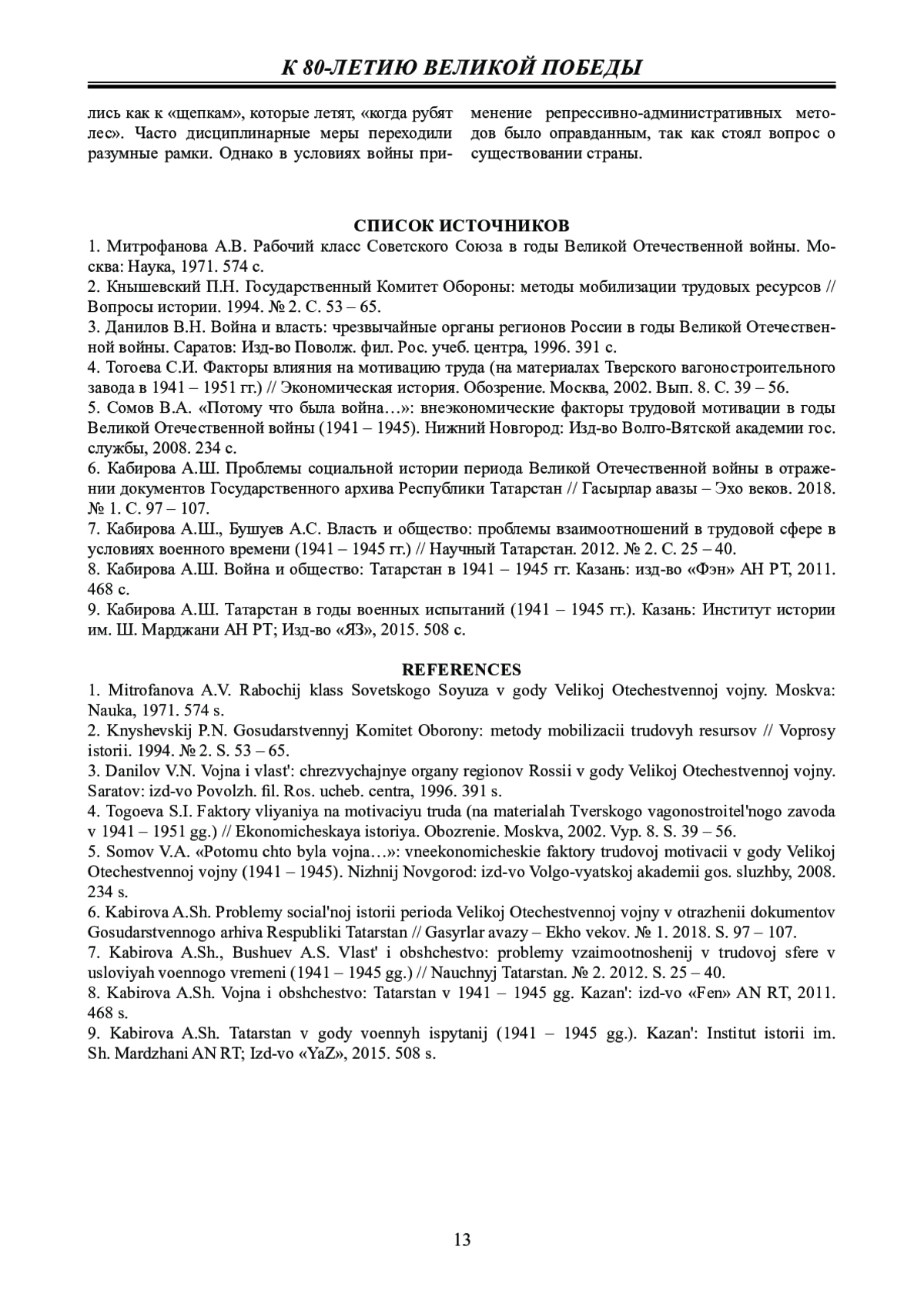 7. 	Кабирова А.Ш., Бушуев А.С. Власть и общество: проблемы взаимоотношений в трудовой сфере в условиях военного времени (1941 - 1945 гг.) // Научный Татарстан. 2012. № 2. С. 25 - 40. EDN: RVNYPJ