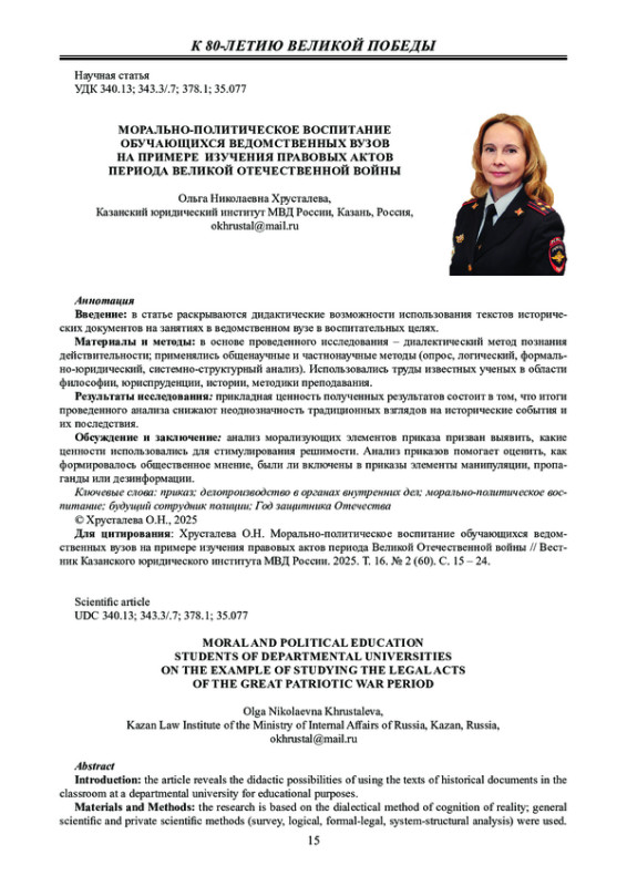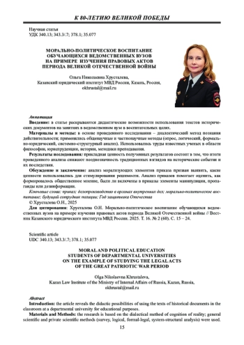 Введение: в статье раскрываются дидактические возможности использования текстов исторических документов на занятиях в ведомственном вузе в воспитательных целях. Материалы и методы: в основе проведенного исследования - диалектический метод познания действительности; применялись общенаучные и частнонаучные методы (опрос, логический, формально-юридический, системно-структурный анализ). Использовались труды известных ученых в области философии, юриспруденции, истории, методики преподавания. Результаты исследования: прикладная ценность полученных результатов состоит в том, что итоги проведенного анализа снижают неоднозначность традиционных взглядов на исторические события и их последствия. Обсуждение и заключение: анализ морализующих элементов приказа призван выявить, какие ценности использовались для стимулирования решимости. Анализ приказов помогает оценить, как формировалось общественное мнение, были ли включены в приказы элементы манипуляции, пропаганды или дезинформации.