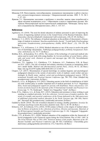 1. Агафонова И.С. Необходимость стоматологического просвещения военнослужащих как части совершенствования системы организации медицинской службы в Вооруженных Силах Российской Федерации // Международный журнал прикладных и фундаментальных исследований. 2019. № 10. С. 45-49.