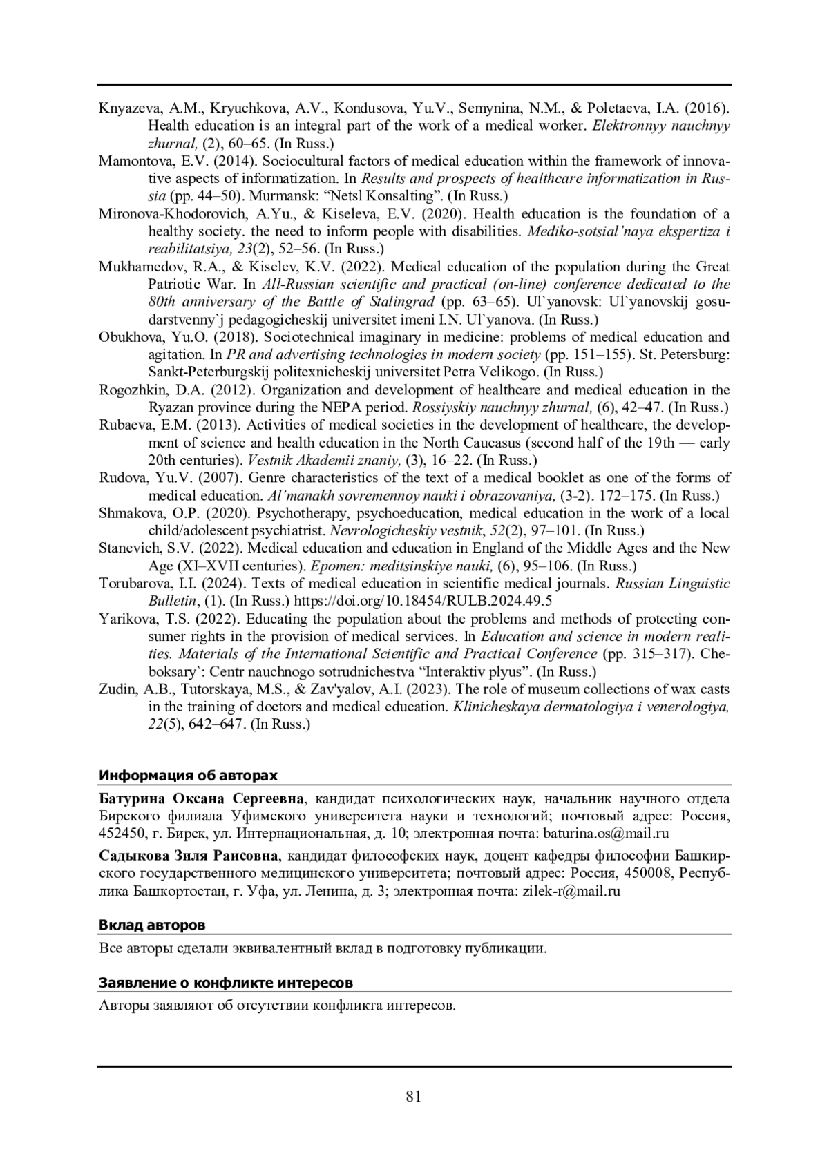 20. Торубарова И.И. Тексты медицинского просвещения в научных медицинских журналах // Российский лингвистический бюллетень. 2024. № 1 (49). DOI: 10.18454/RULB.2024.49.5
