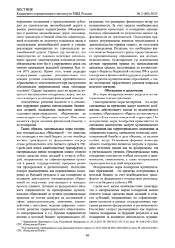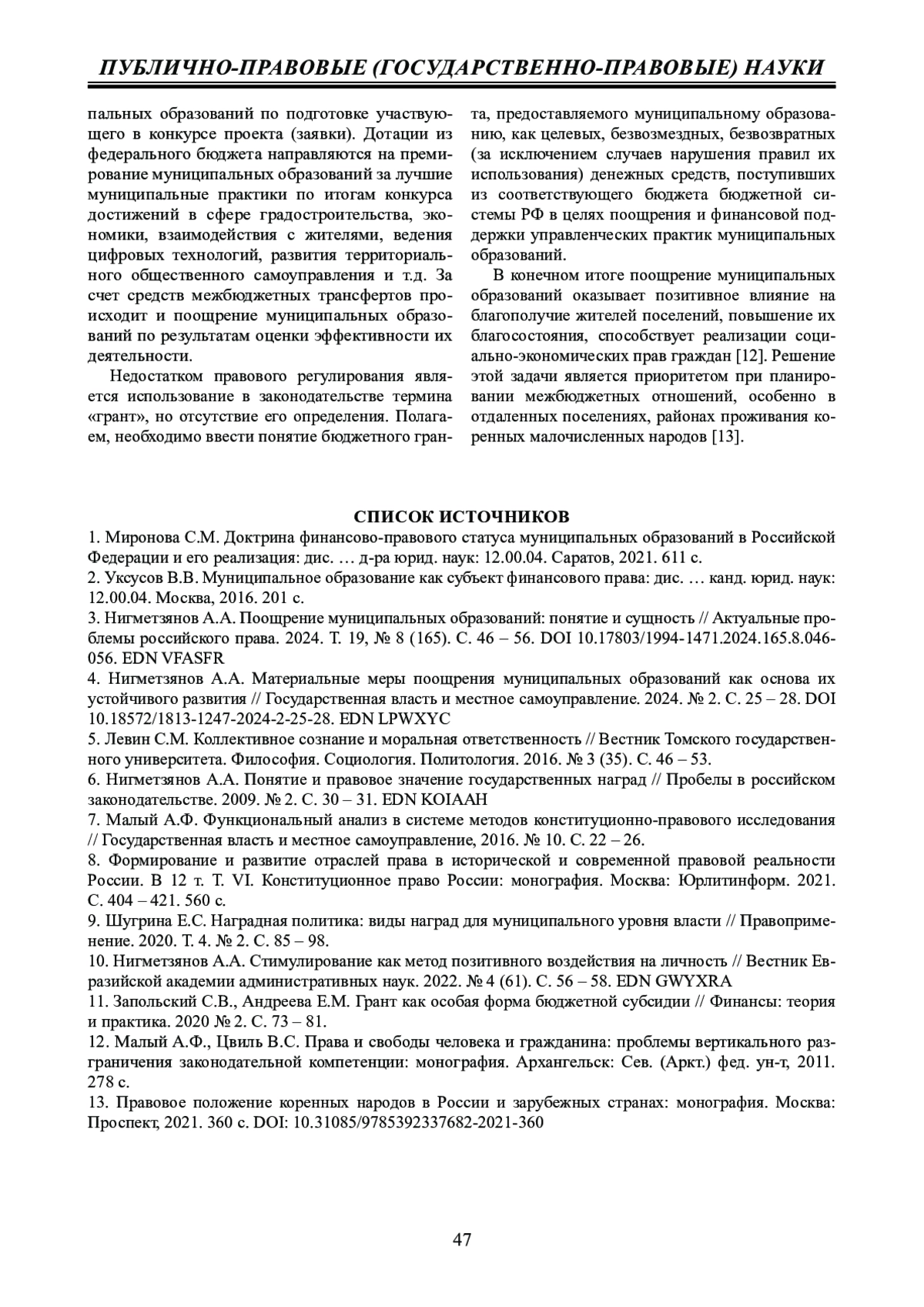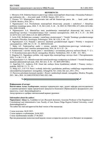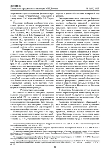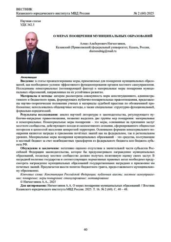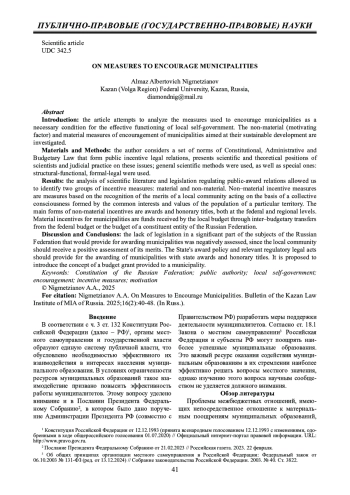 3. 	Нигметзянов А.А. Поощрение муниципальных образований: понятие и сущность // Актуальные проблемы российского права. 2024. Т. 19, № 8 (165). С. 46 - 56. DOI: 10.17803/1994-1471.2024.165.8.046-056 EDN: VFASFR