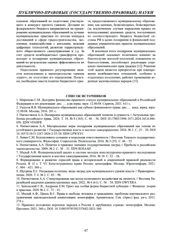 1. 	Миронова С.М. Доктрина финансово-правового статуса муниципальных образований в Российской Федерации и его реализация: дис. … д-ра юрид. наук: 12.00.04. Саратов, 2021. 611 с. EDN: DDCGYY