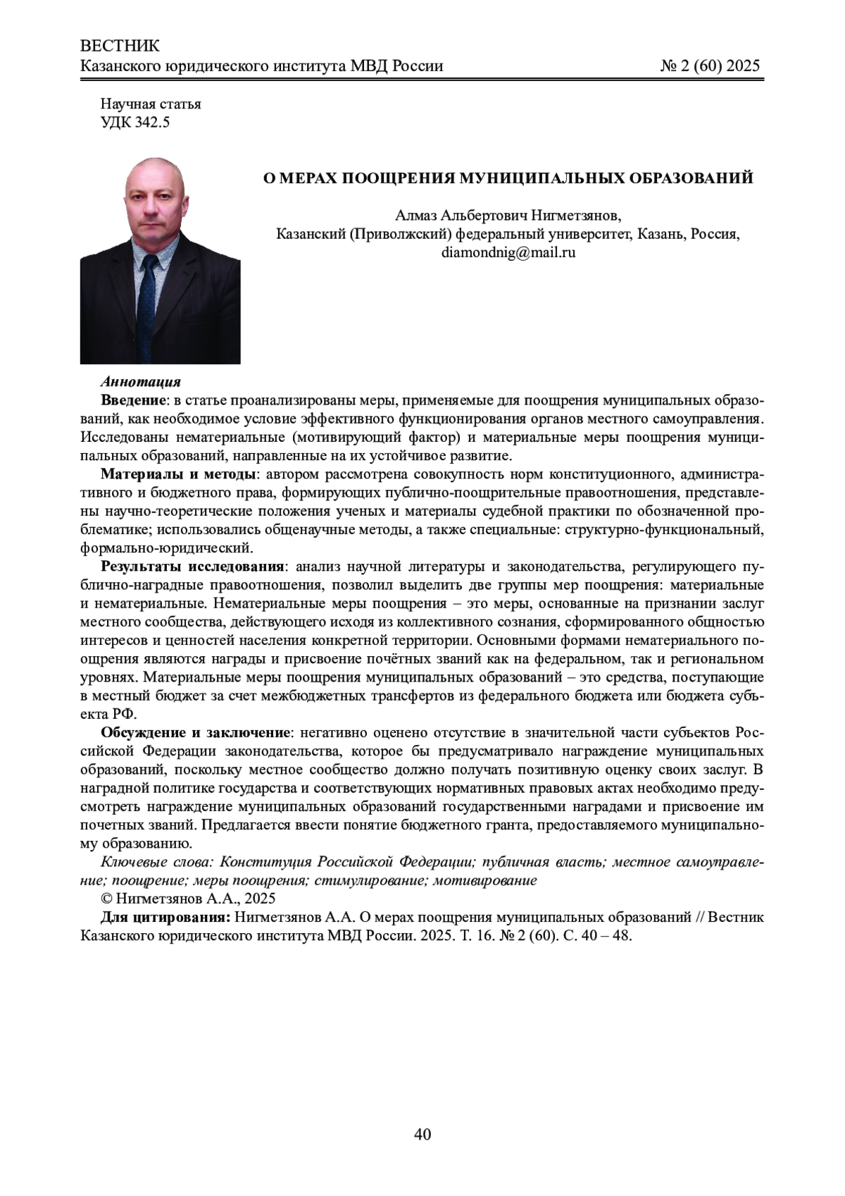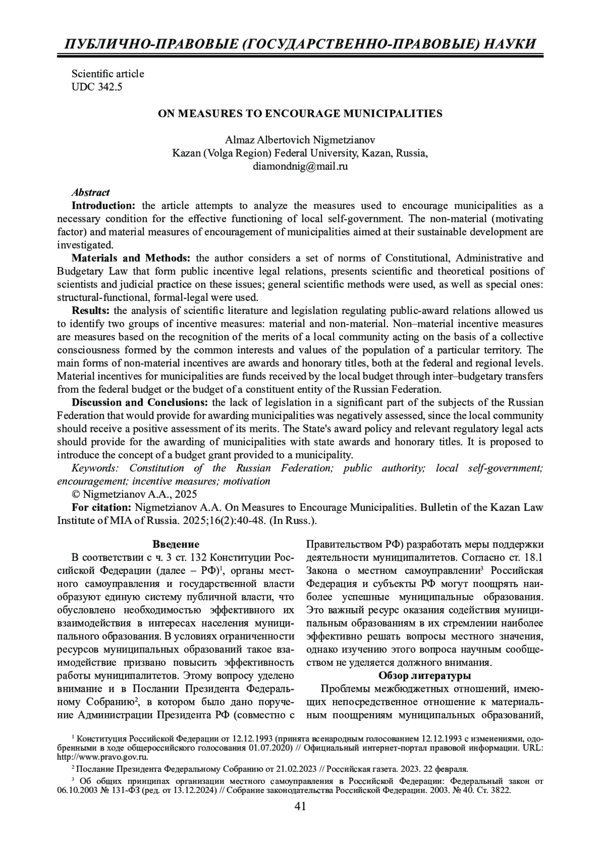 4. 	Нигметзянов А.А. Материальные меры поощрения муниципальных образований как основа их устойчивого развития // Государственная власть и местное самоуправление. 2024. № 2. С. 25 - 28. DOI: 10.18572/1813-1247-2024-2-25-28 EDN: LPWXYC