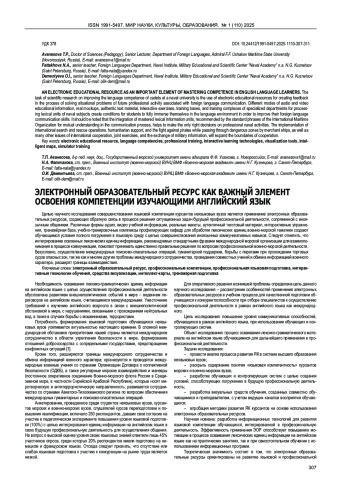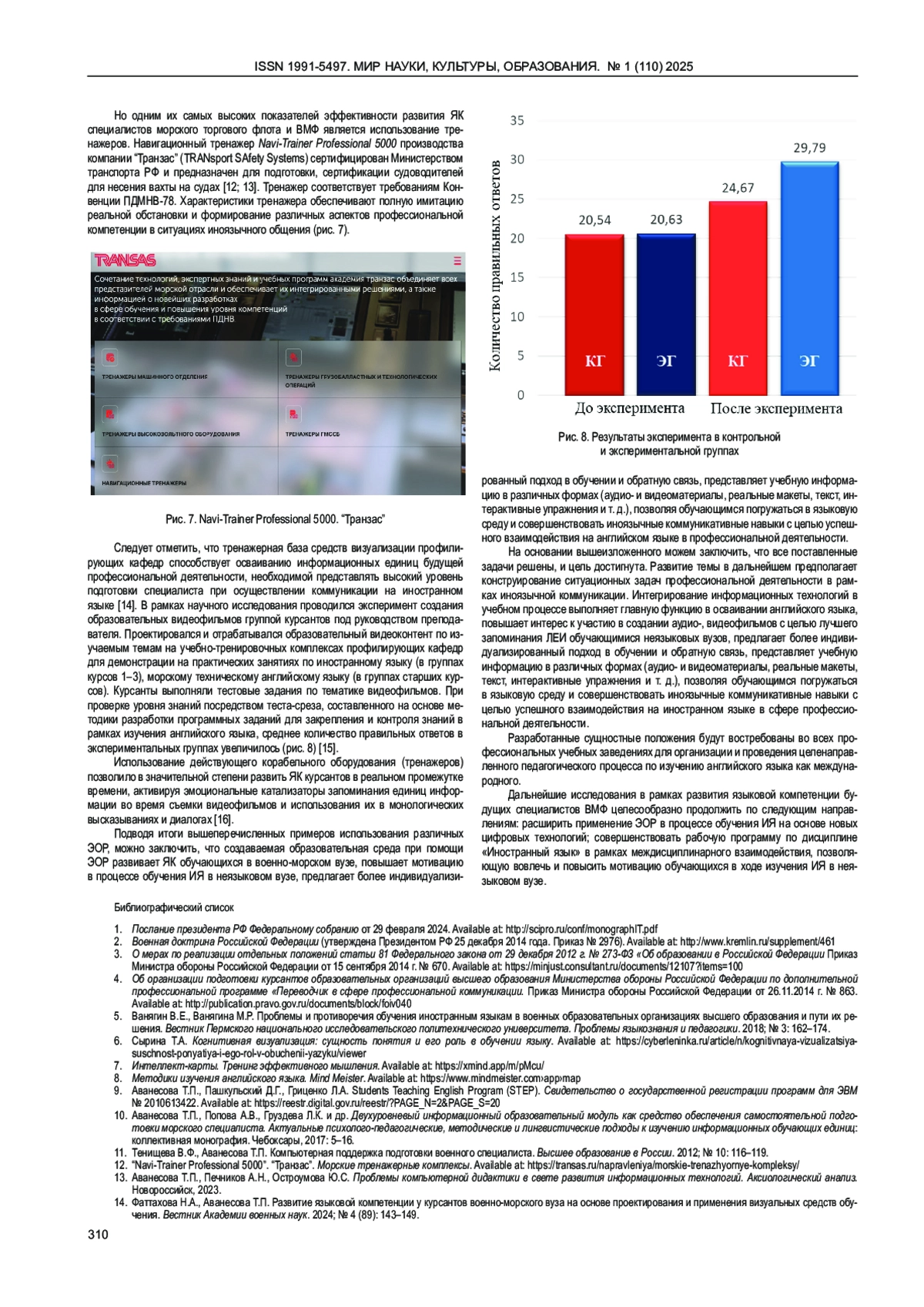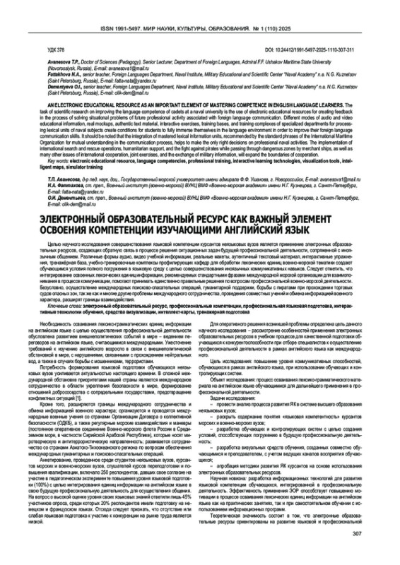 14. 	Фаттахова Н.А., Аванесова Т.П. Развитие языковой компетенции у курсантов военно-морского вуза на основе проектирования и применения визуальных средств обучения. Вестник Академии военных наук. 2024; № 4 (89): 143-149. EDN: HHDIXQ