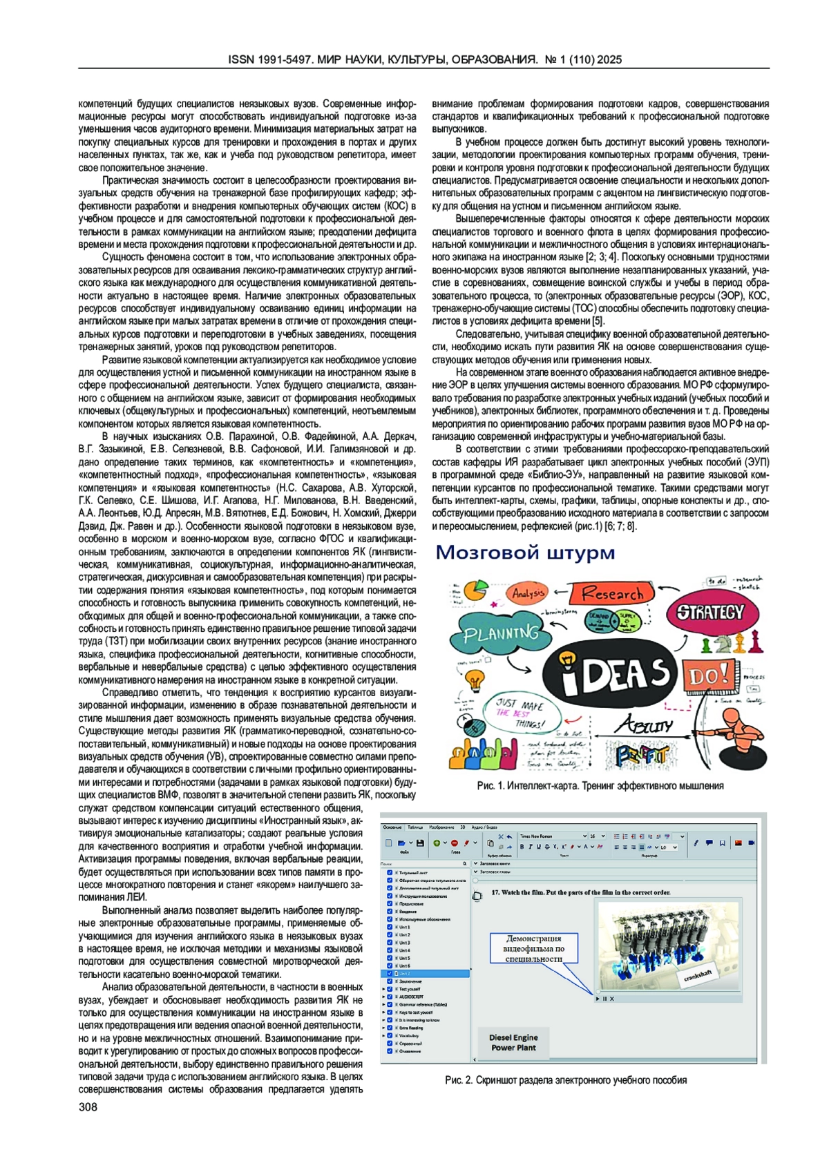 Целью научного исследования совершенствования языковой компетенции курсантов неязыковых вузов является применение электронных образовательных ресурсов, создающих обратную связь в процессе решения ситуационных задач будущей профессиональной деятельности, сопряженной с иноязычным общением. Различные формы аудио, видео учебной информации, реальные макеты, аутентичный текстовый материал, интерактивные упражнения, тренажёрная база, учебно-тренировочные комплексы профилирующих кафедр для обработки лексических единиц военно-морской тематики создают обучающимся условия полного погружения в языковую среду с целью совершенствования иноязычных коммуникативных навыков. Следует отметить, что интегрирование освоенных лексических единиц информации, рекомендуемых стандартными фразами международной морской организации для взаимопонимания в процессе коммуникации, помогают принимать единственно правильные решения по вопросам профессиональной военно-морской деятельности. Безусловно, осуществление международных поисково-спасательных операций, гуманитарной поддержки, борьбы с пиратами при прохождении торговых судов опасных зон, так же как и многие другие проблемы международного сотрудничества, проведения совместных учений и обмена информацией военного характера, расширят границы взаимодействия.