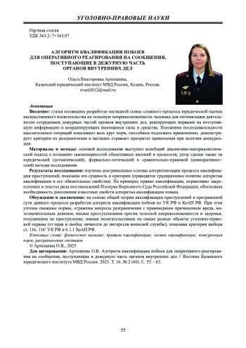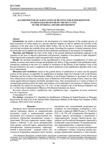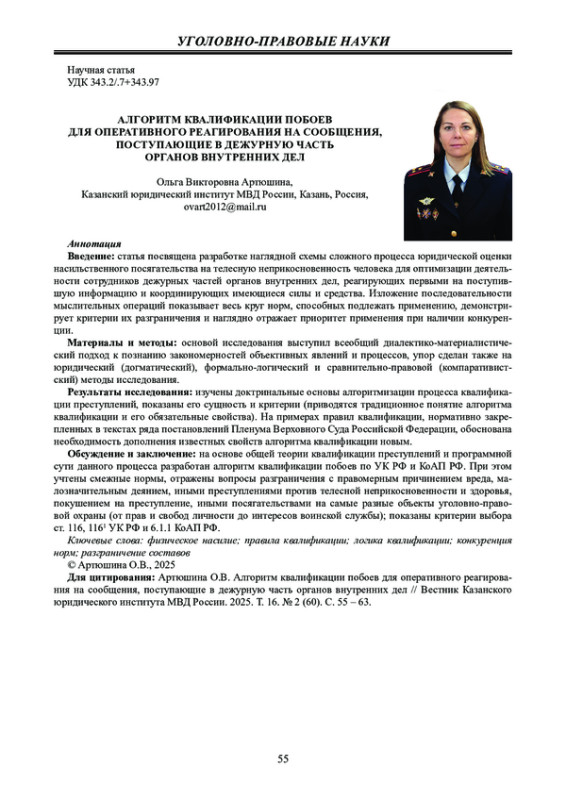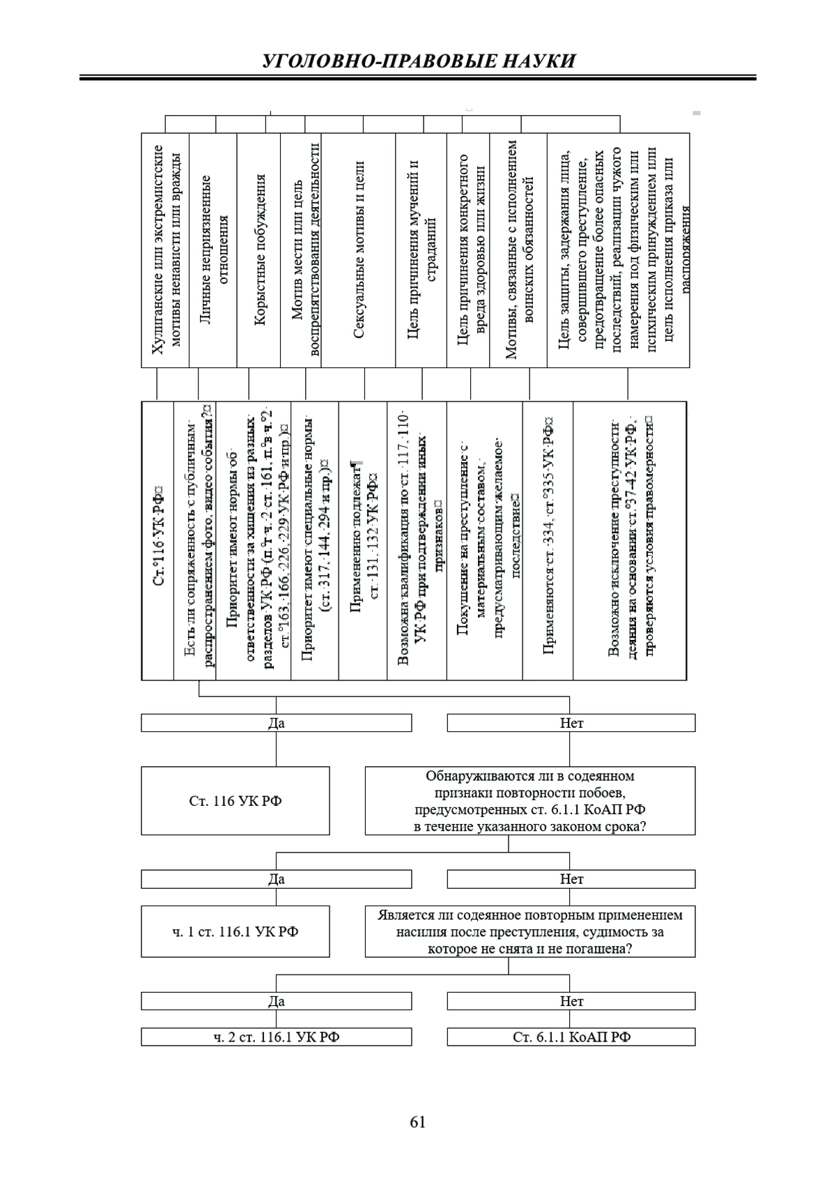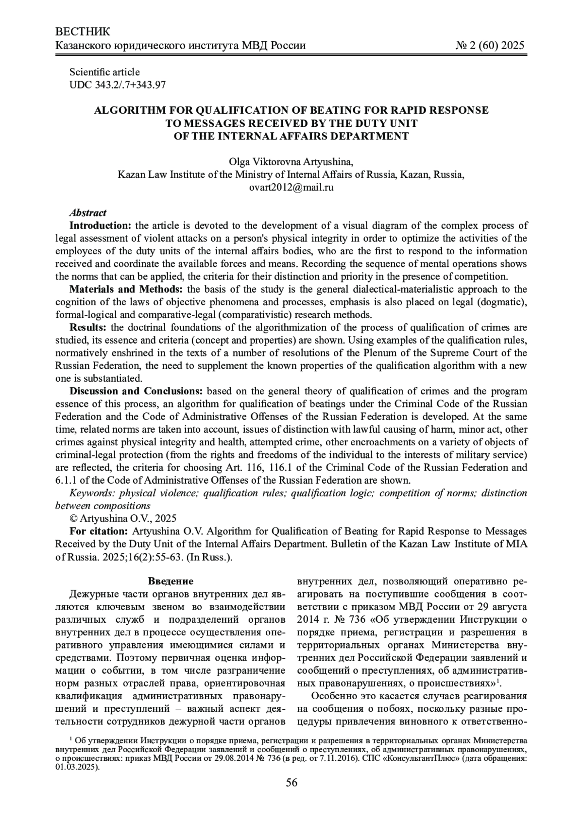 Введение: статья посвящена разработке наглядной схемы сложного процесса юридической оценки насильственного посягательства на телесную неприкосновенность человека для оптимизации деятельности сотрудников дежурных частей органов внутренних дел, реагирующих первыми на поступившую информацию и координирующих имеющиеся силы и средства. Изложение последовательности мыслительных операций показывает весь круг норм, способных подлежать применению, демонстрирует критерии их разграничения и наглядно отражает приоритет применения при наличии конкуренции.