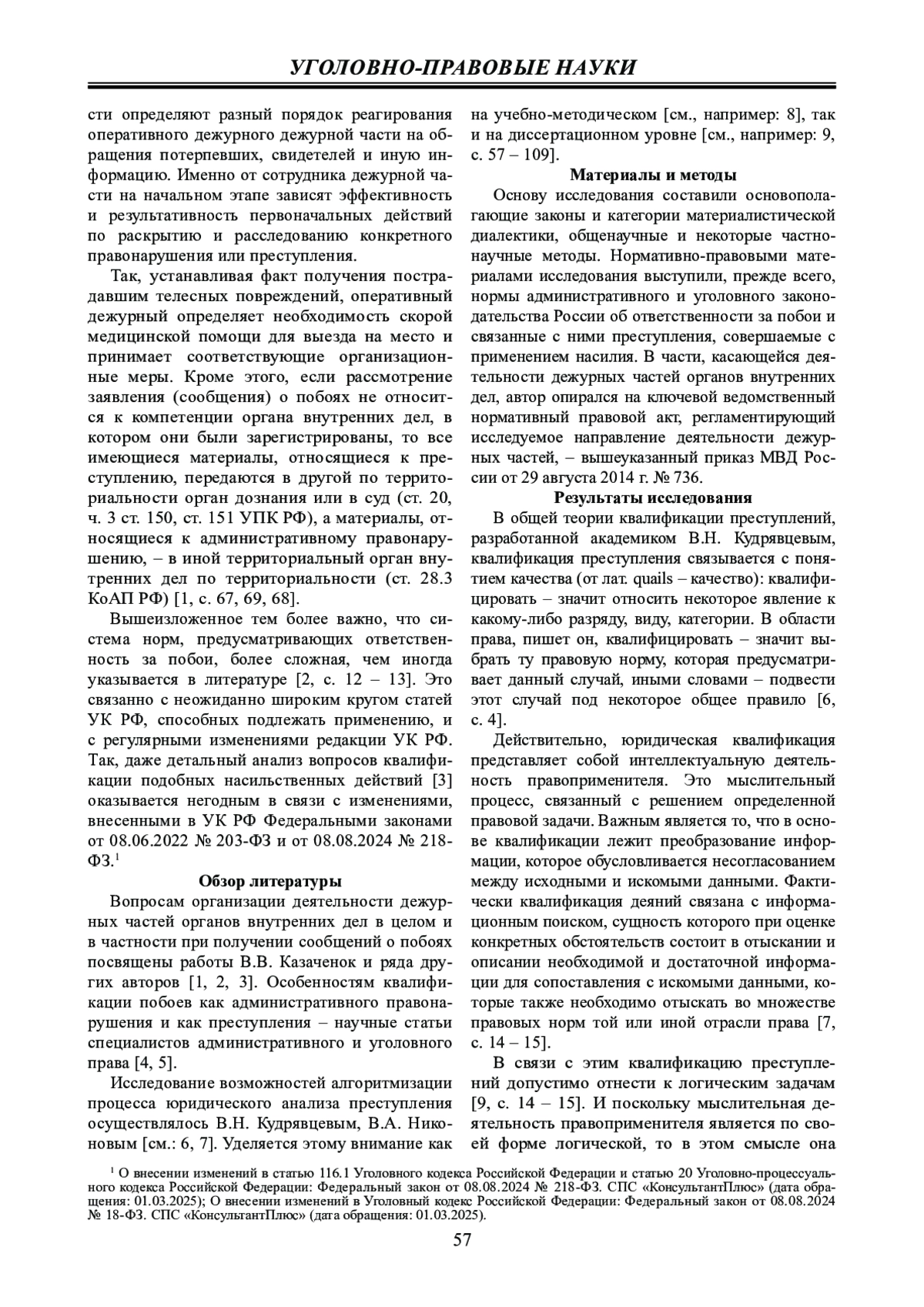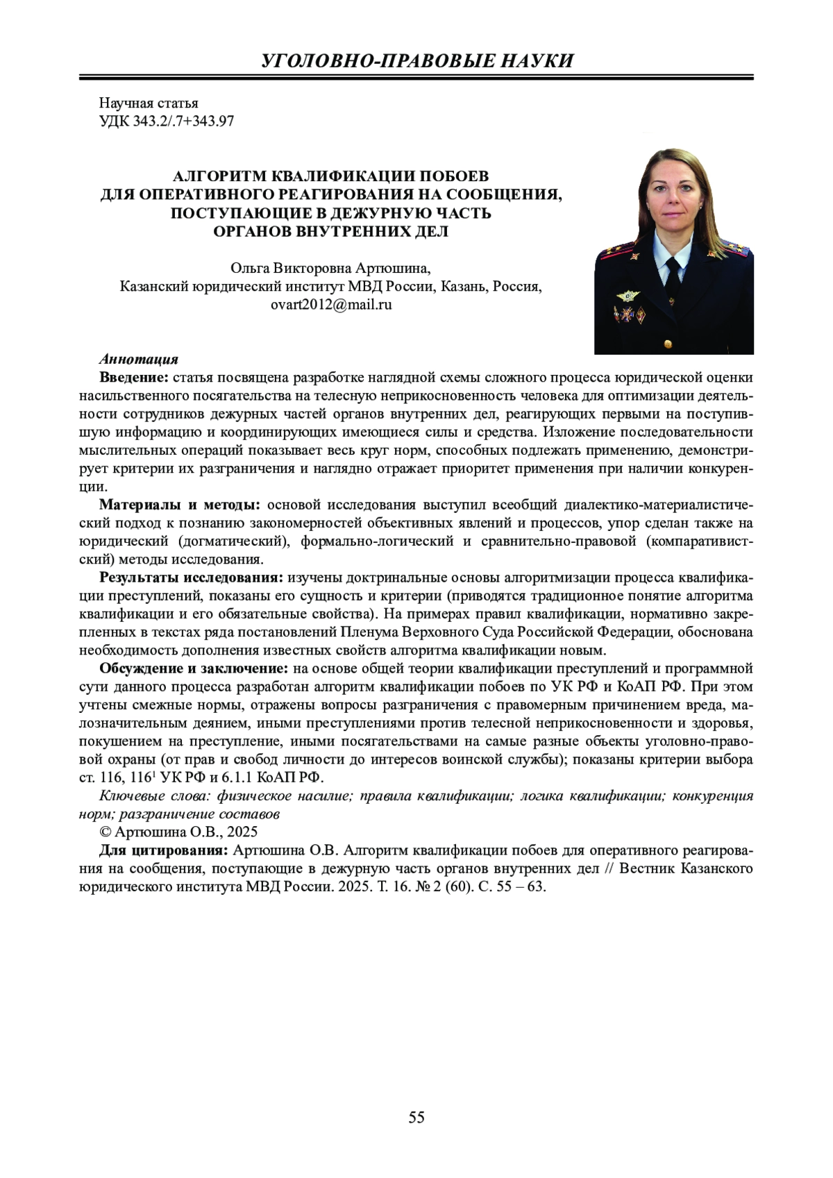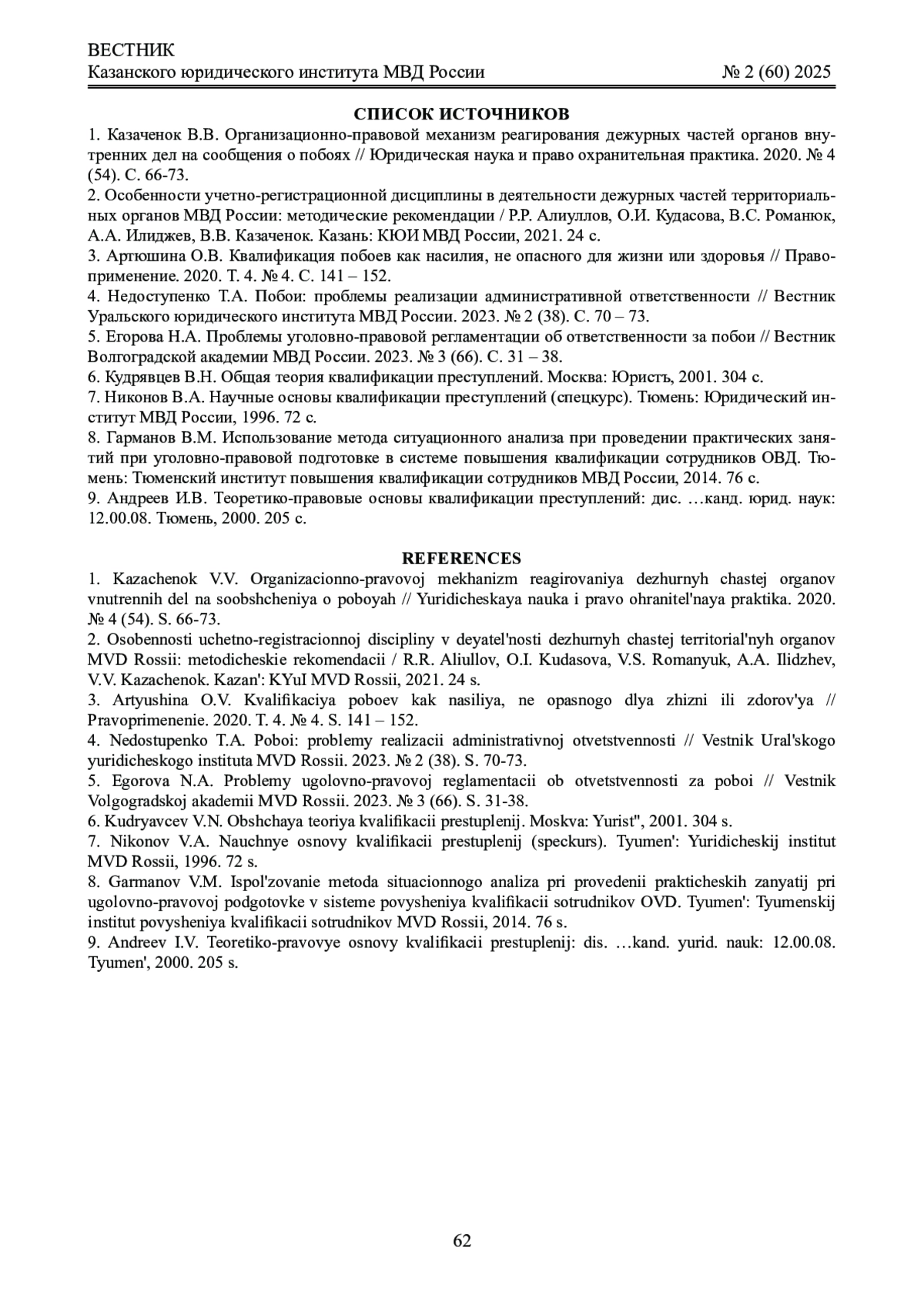 1. 	Казаченок В.В. Организационно-правовой механизм реагирования дежурных частей органов внутренних дел на сообщения о побоях // Юридическая наука и право охранительная практика. 2020. № 4 (54). С. 66-73. EDN: YGXZAG