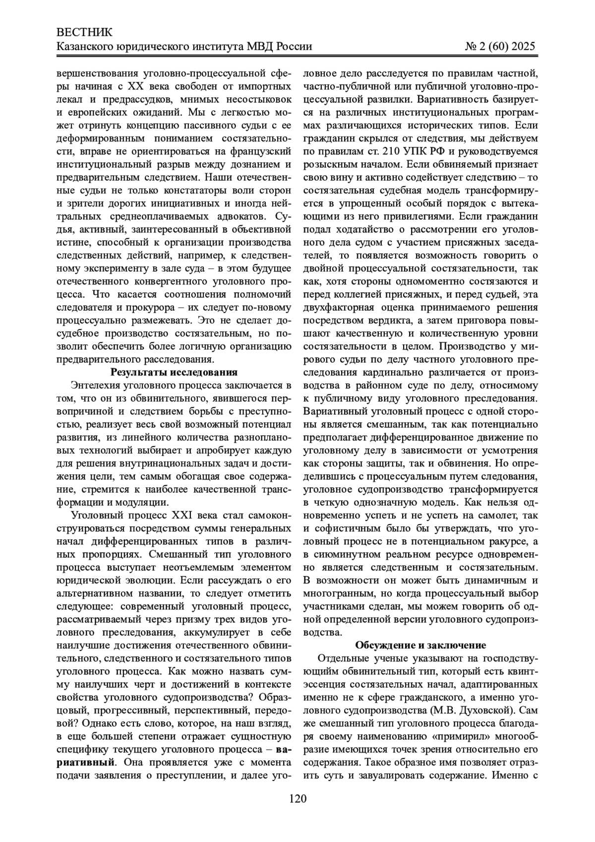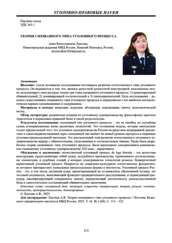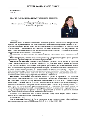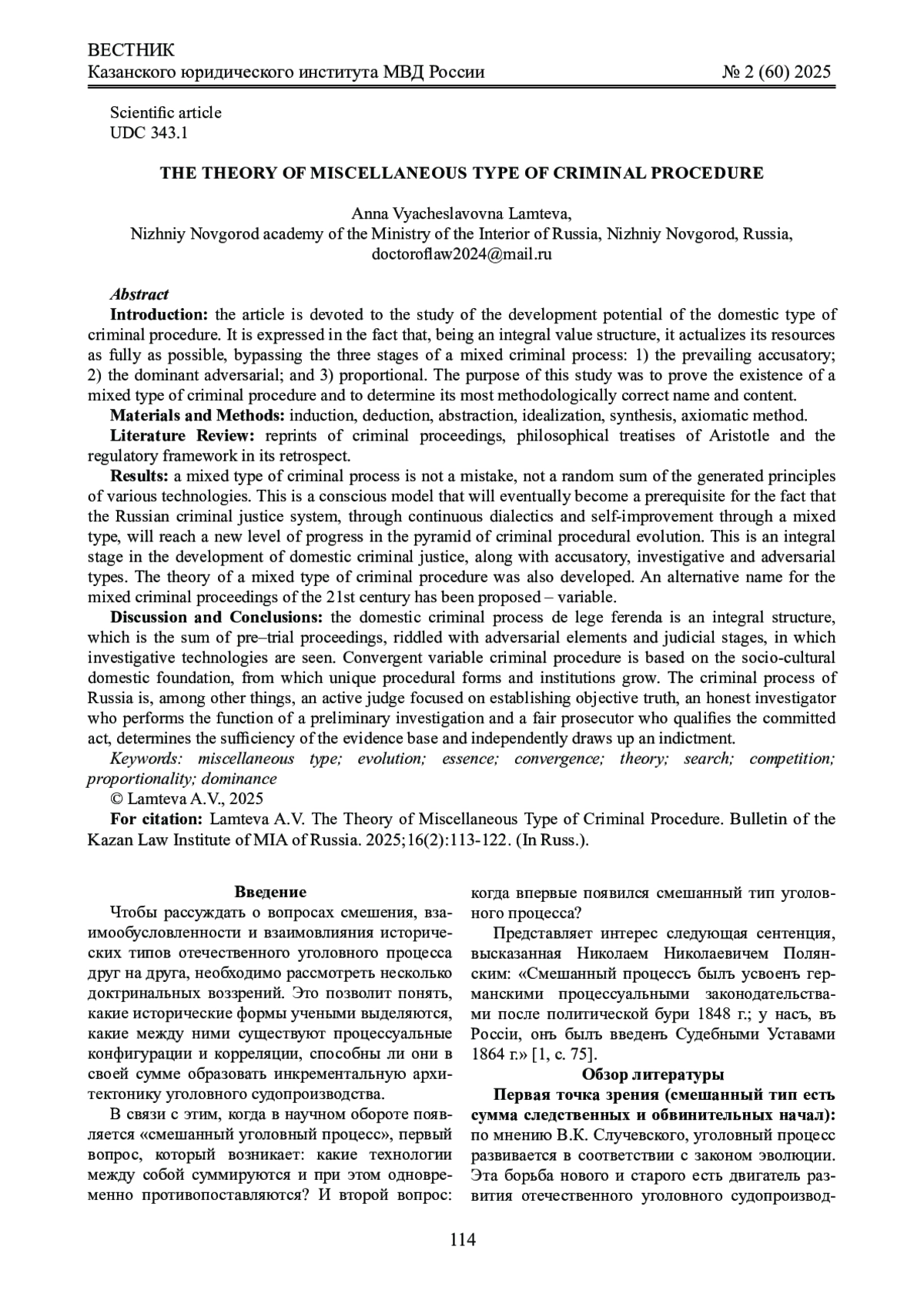 Введение: статья посвящена исследованию потенциала развития отечественного типа уголовного процесса. Он выражается в том, что, являясь целостной ценностной конструкцией, максимально полно актуализирует свои ресурсы, минуя три этапа смешанного уголовного процесса: 1) превалирующий обвинительный; 2) доминирующий состязательный и 3) пропорциональный. Цель исследования - доказать существование смешанного типа уголовного процесса и определиться с его наиболее методологически верным наименованием и содержанием. Материалы и методы: индукция, дедукция, абстракция, идеализация, синтез, аксиоматический метод. Обзор литературы: репринтные издания по уголовному судопроизводству, философские трактаты Аристотеля и нормативно-правовой базис в своей ретроспективе. Результаты исследования: cмешанный тип уголовного процесса - это не ошибка, не случайная сумма сгенерированных начал различных технологий. Это осознанная модель, которая эвентуально станет предпосылкой того, что уголовное судопроизводство России посредством непрерывной диалектики и самосовершенствования через смешанный тип выйдет на новый уровень прогресса в пирамиде уголовно-процессуальной эволюции. Это неотъемлемый этап развития отечественного уголовного судопроизводства наряду с обвинительным, следственным и состязательным типами. Также была разработана теория смешанного типа уголовного процесса. Было предложено альтернативное наименование смешанному уголовному судопроизводству XXI века - вариативное. Обсуждение и заключение: отечественный уголовный процесс de lege ferenda - это целостная конструкция, представляющая собой сумму досудебного производства, пронизанного состязательными элементами, и судебных стадий, в которых усматриваются технологии розыска. Конвергентный вариативный уголовный процесс базируется на социально-культурном отечественном фундаменте, из которого произрастают уникальные процессуальные формы и институты. Уголовный процесс России - это, в том числе, активный судья, ориентированный на установление объективной истины, это честный следователь, выполняющий функцию предварительного расследования, и справедливый прокурор, квалифицирующий совершенное деяние, определяющий достаточность доказательственной базы и самостоятельно составляющий обвинительное заключение.